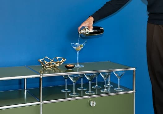 NOUVEAU TEINTE STANDARD : USM Haller Lowboard en vert olive avec deux portes rabattables. Le lowboard USM Haller avec deux abattants et espace de rangement intermédiaire est fait pour ranger ton lecteur DVD ou CD, ta console vidéo ou tes magazines de télévision. Les deux compartiments supérieurs sont complètement ouverts, ce qui signifie que les câbles peuvent y passer sans problème jusqu'à la prise électrique. Les deux compartiments inférieurs sont équipés de portes rabattables pratiques qui s'ouvrent facilement vers le bas et permettent de ranger tout ce dont on a besoin à l'abri des regards. Ce meuble est également adapté pour la salle de bain ou la chambre à coucher, offrant une apparence sobre et intemporelle dans une belle couleur vert olive.