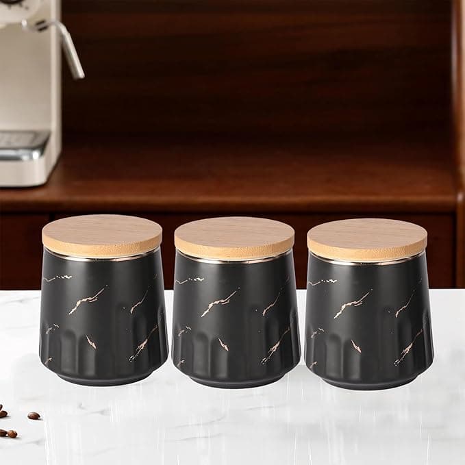 Kuber Industries Set of 3 (650 ml) Airtight Ceramic Salt Jar Storage Set with Bamboo Wooden Lid For Kitchen Condiment | Chini Mitti Pots Container for Achar | Black & Gold Marble Print