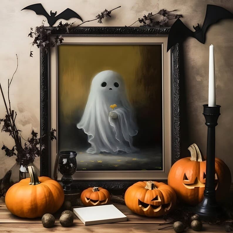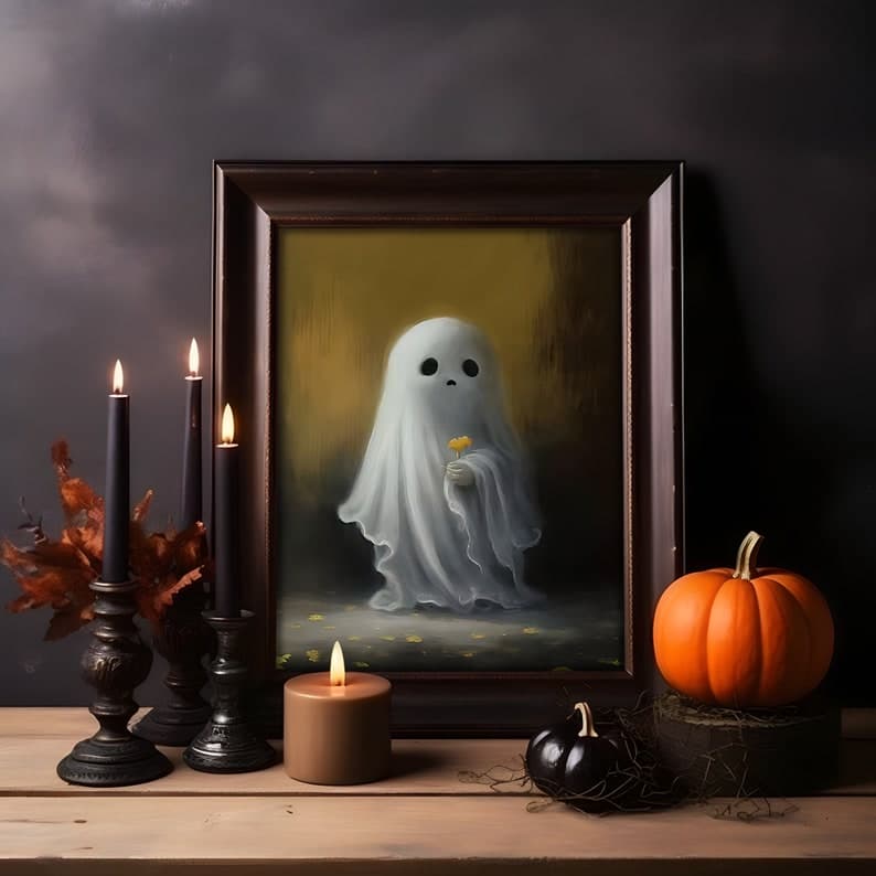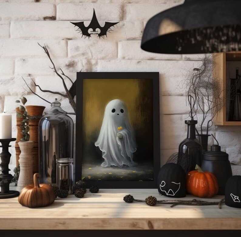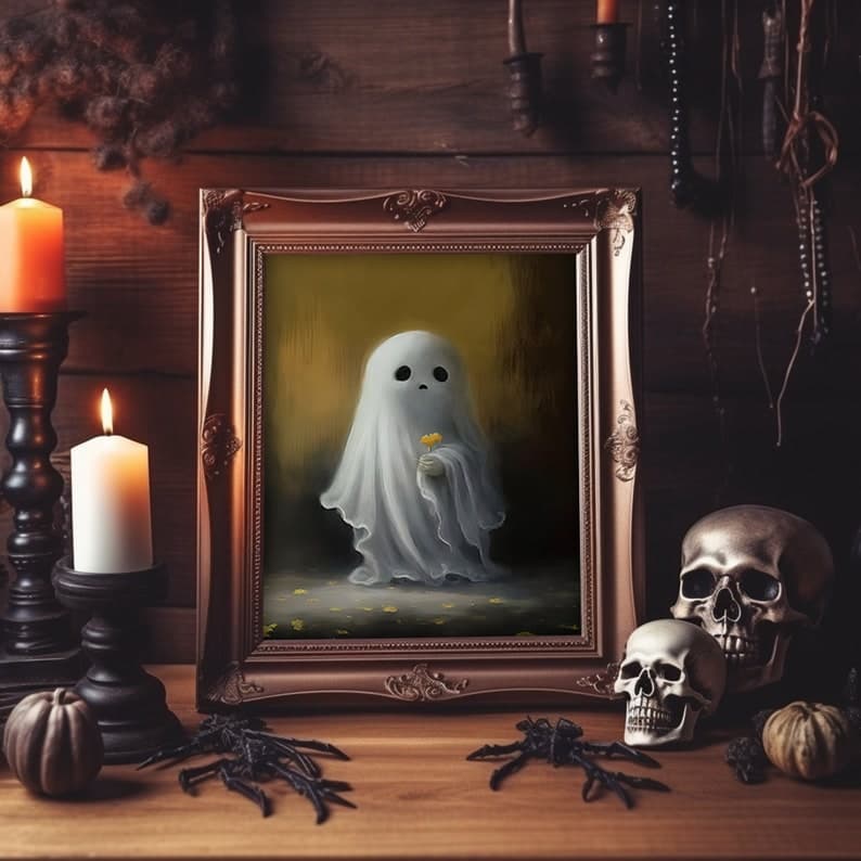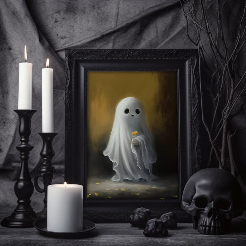 Halloween Flower Ghost Poster, Sheeted Ghost Art Print, Halloween Wall Art, Halloween Gift, Cute Little Ghost, Gothic Spooky Art, Poster