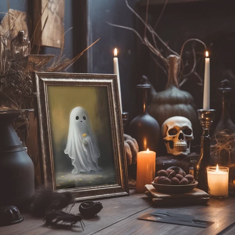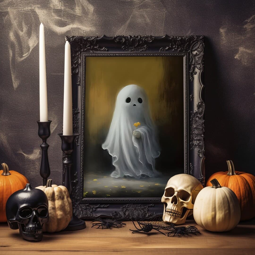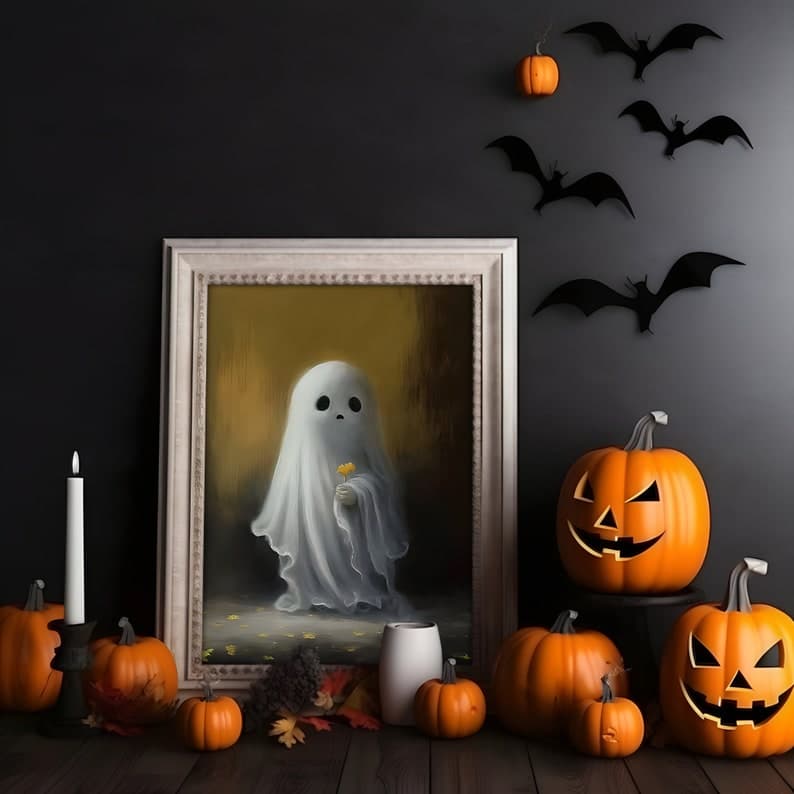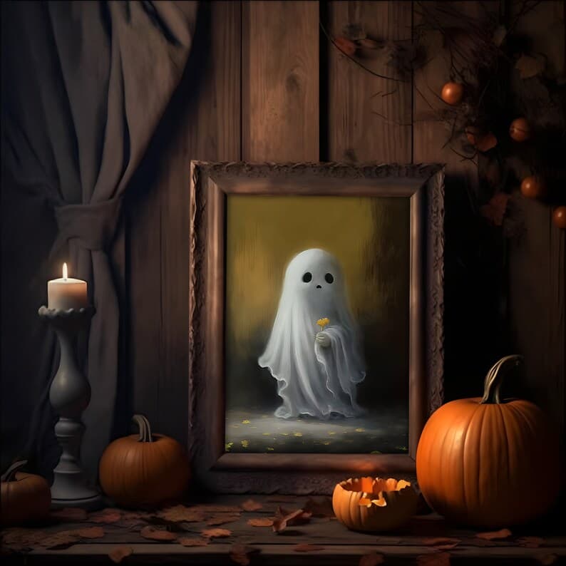 Halloween Flower Ghost Poster, Sheeted Ghost Art Print, Halloween Wall Art, Halloween Gift, Cute Little Ghost, Gothic Spooky Art, Poster