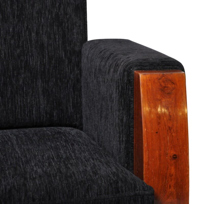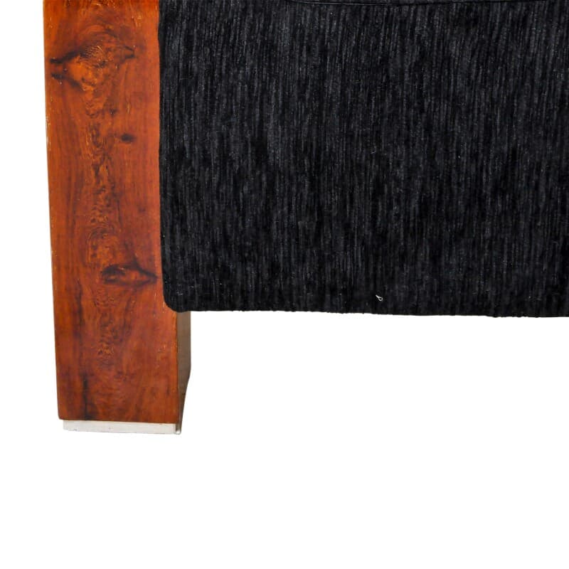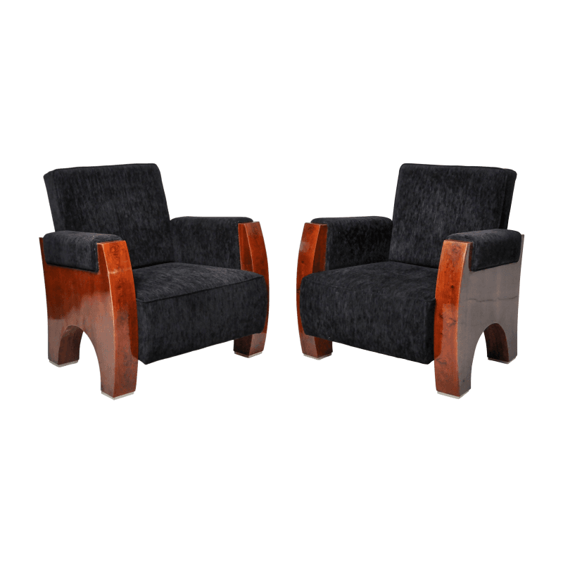 Hungarian Art Deco Style lounge chairs. Sold as a set of 2. Walnut veneer and chenille upholstery. Squared arms and finished with walnut veneer on both sides and front. This item is final sale and not eligible for return.