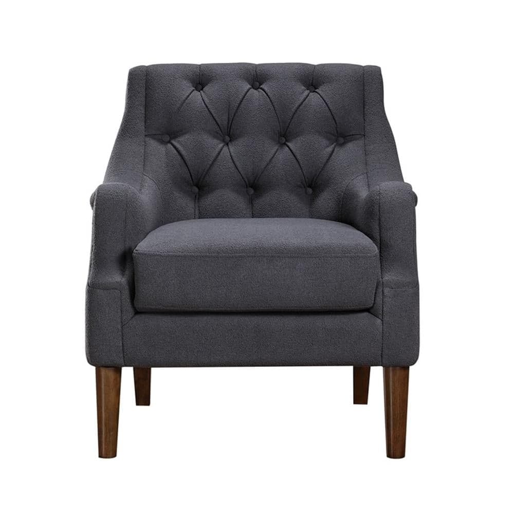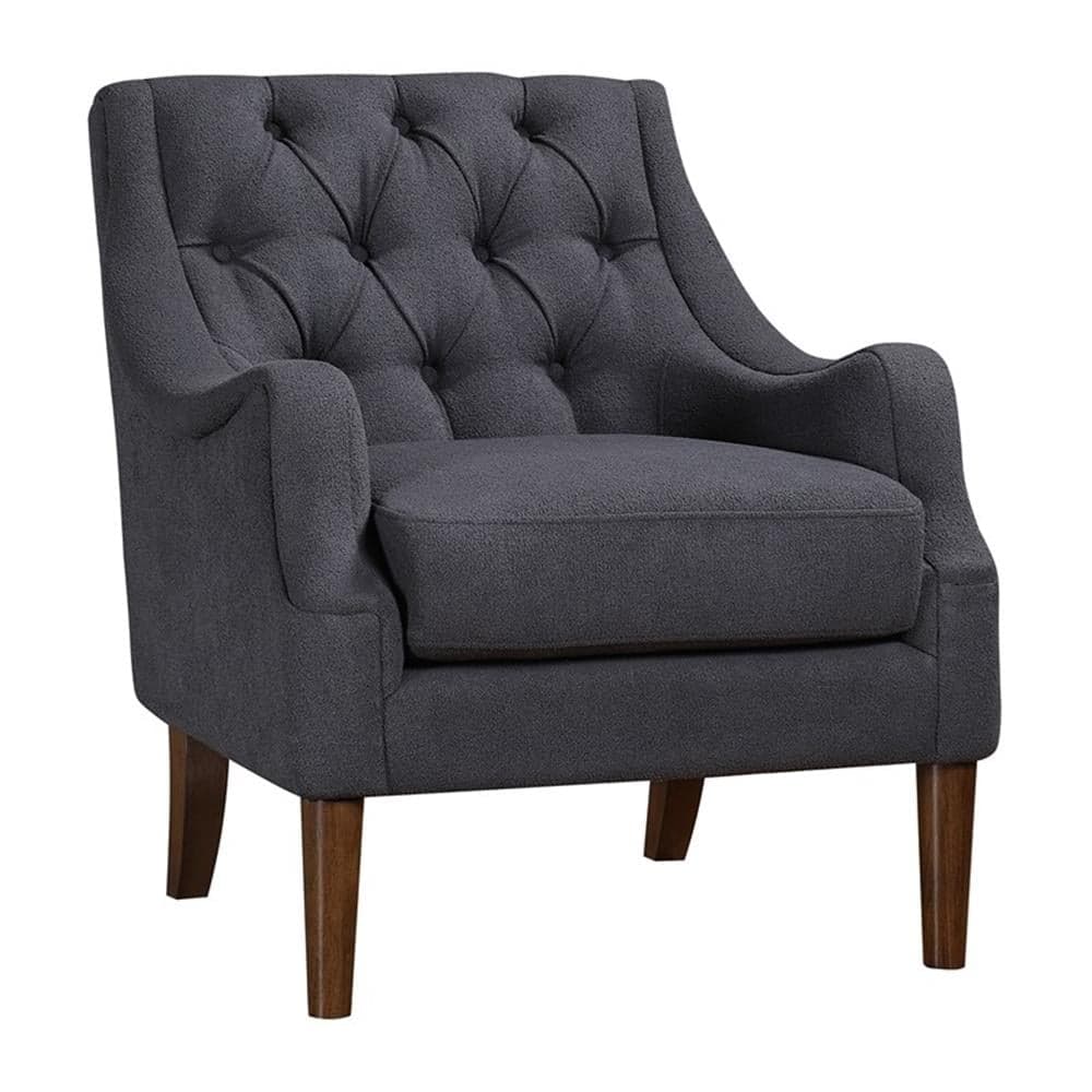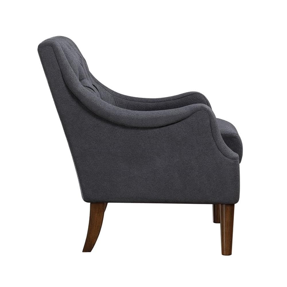 With a look that encompasses the refined accenting of traditional design and a tailored profile that has hints of modern styling, the Stella Collection is an elegant addition to your home’s décor. Dark brown finished solid wood legs provide support to the subtle curves of the chair’s frame, while providing contrast to the dark gray boucle upholstered fabric. Button tufted detailing solidifies the classic look.