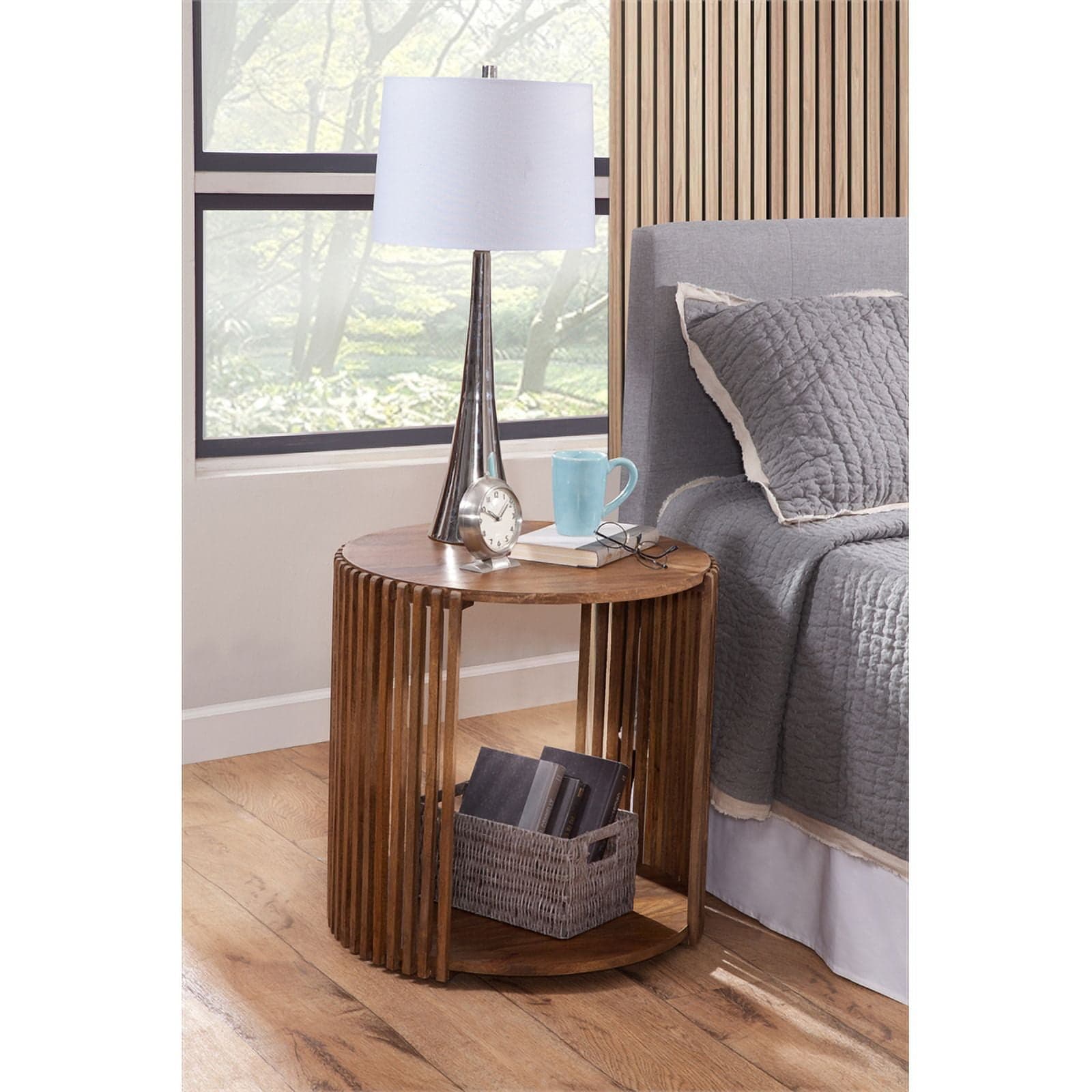 The Fenwick round end table features an open concept design, with spindle slats along the sides, exposing bottom shelf that is perfect for housing reading materials or showcasing decorative accessories. At 24-inches tall, this table is ideal for placement next to your sofa as an end table. It may also be used as an accent table or a space-saving nightstand. The unique design exudes rustic, industrial, and mid-century modern styling in a dark mango finish that will complement any living room or den. The table is also ideal for coastal home decor. Solid mango wood construction ensures durability and longevity, and the circular design will balance any space.