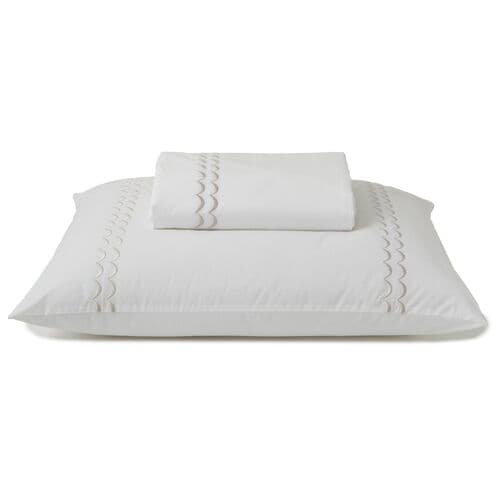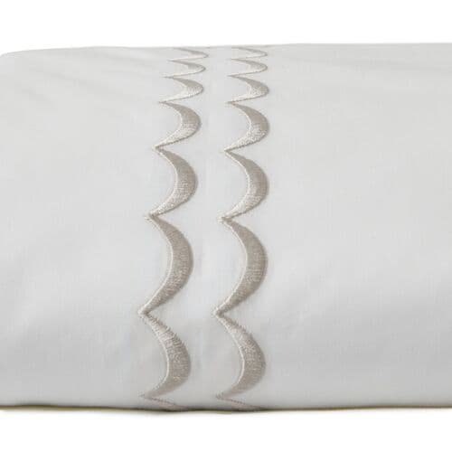 A scallop motif brings a touch of elegance to this duvet set, which is available only at One Kings Lane. It is crafted in the USA from Portugal-made cotton known for its excellent quality.