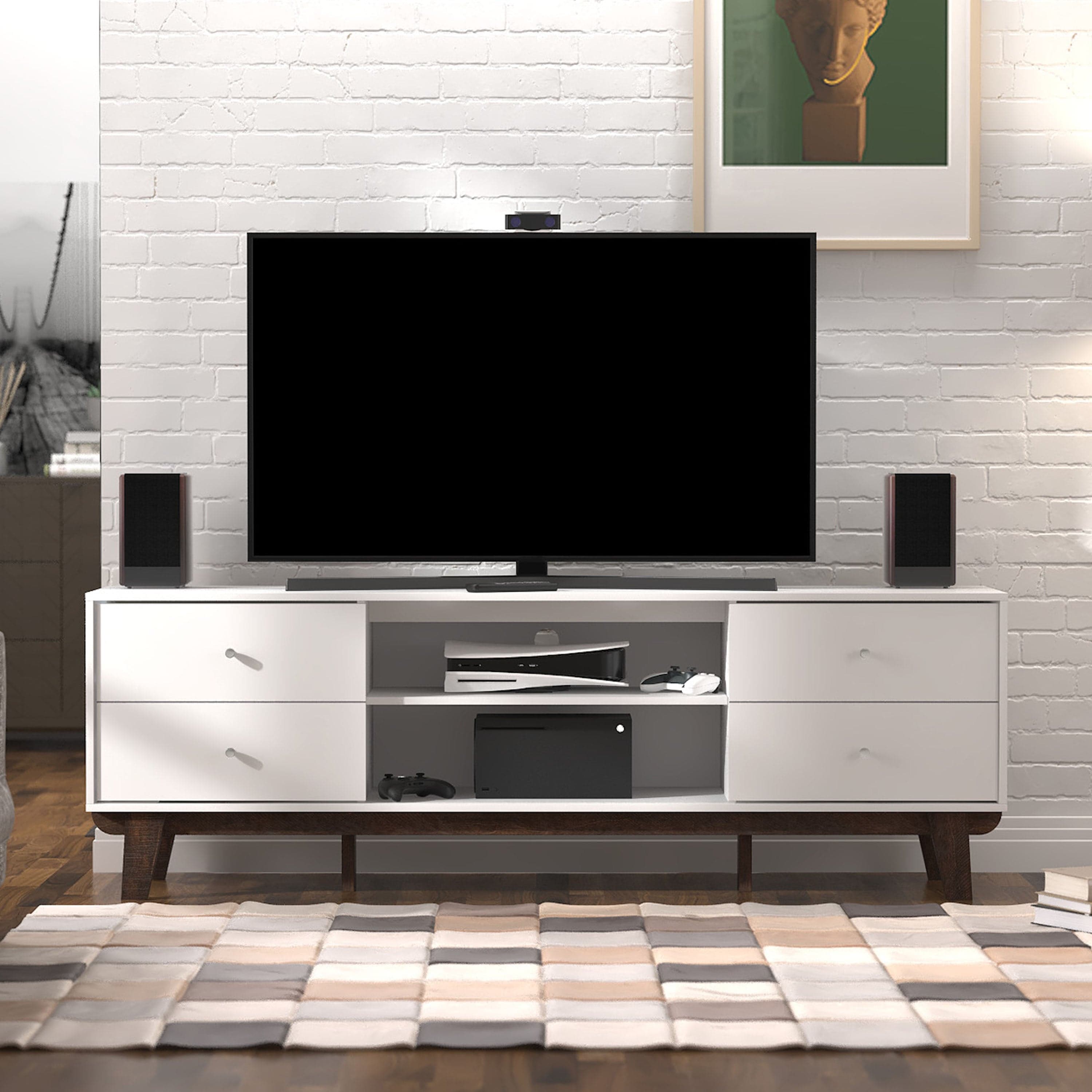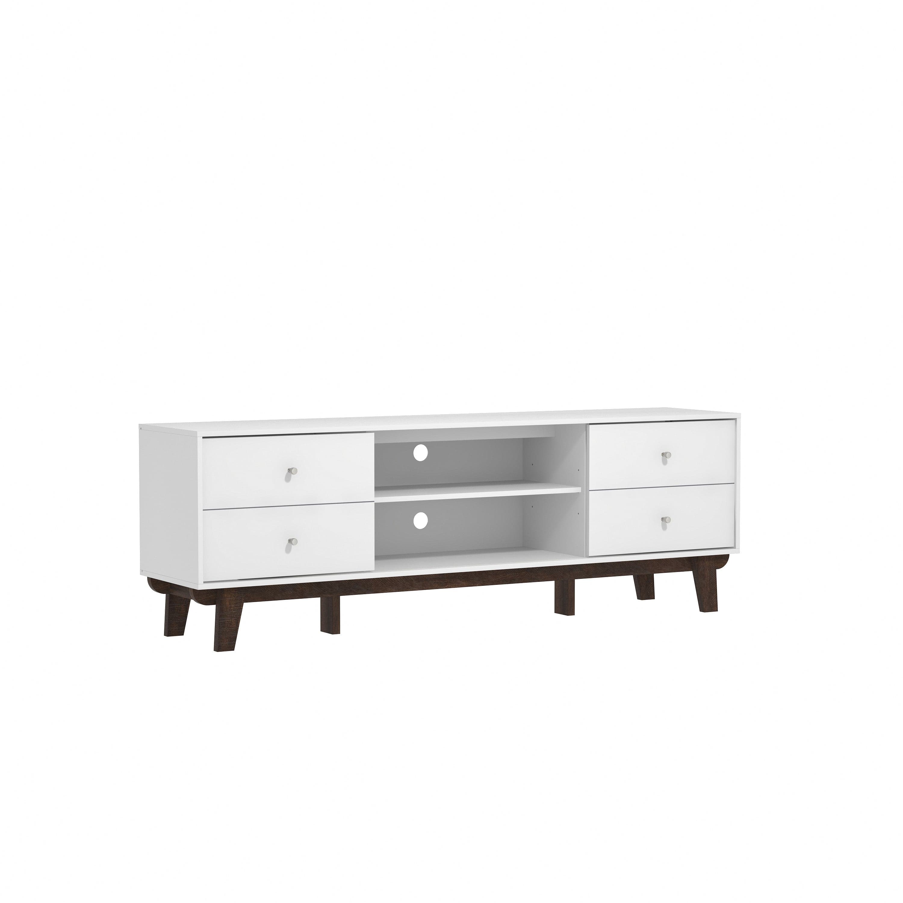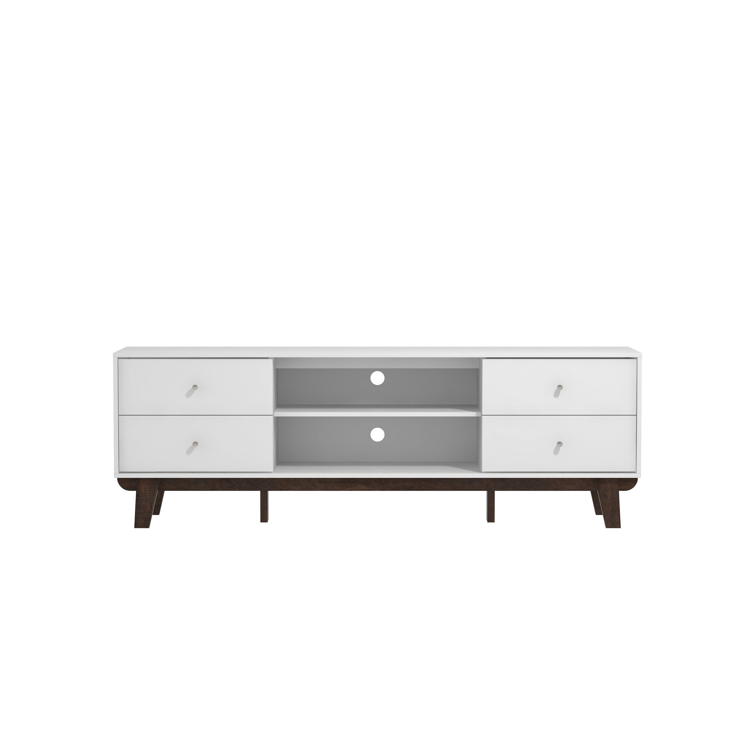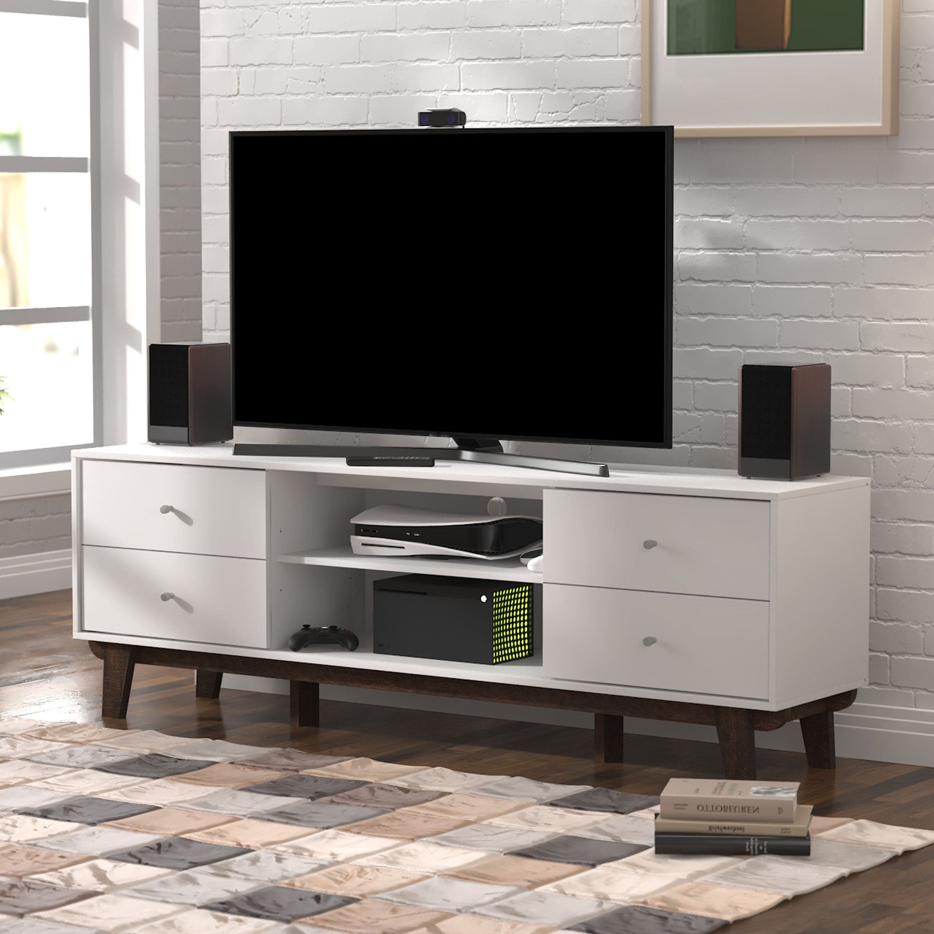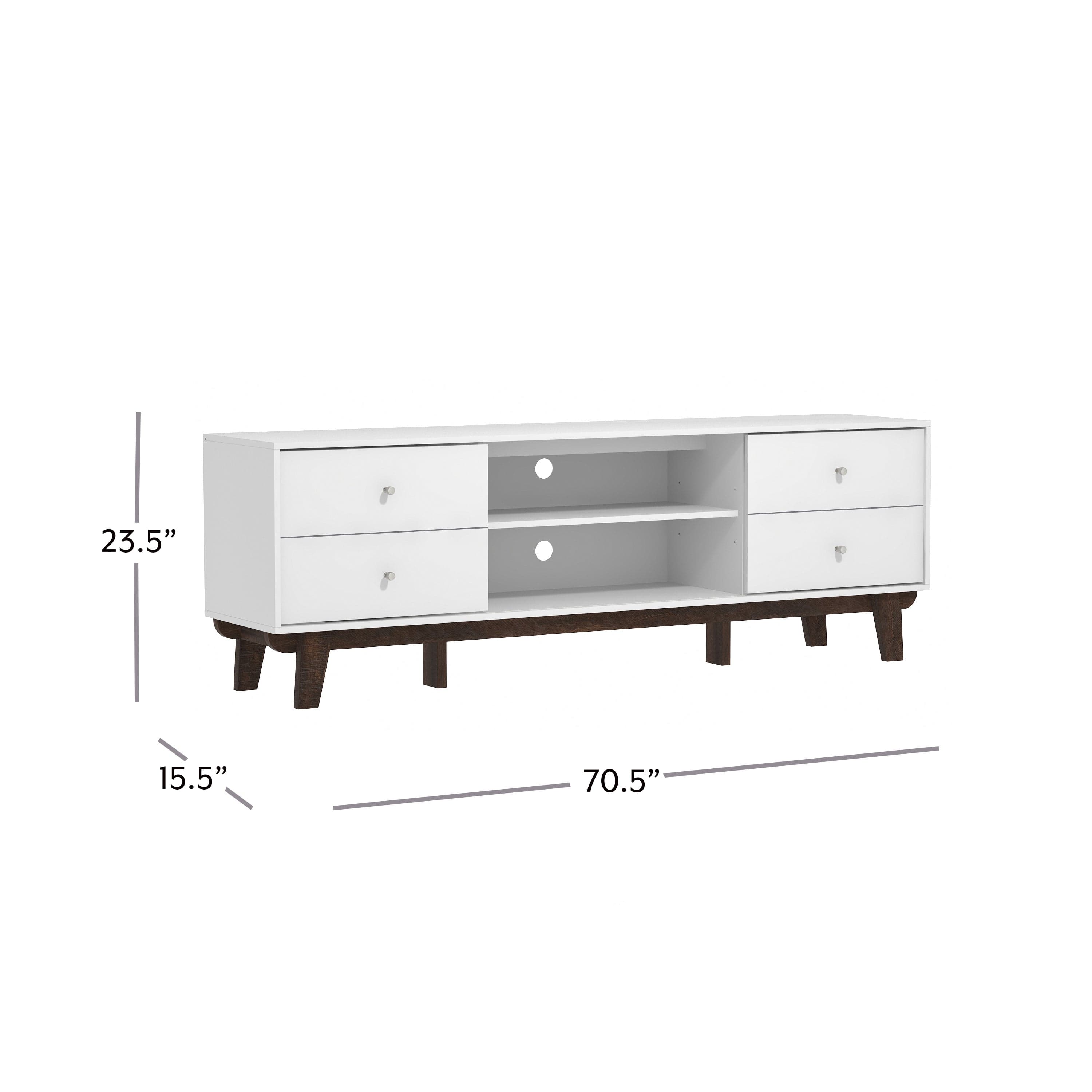 Looking for fun, stylish-yet-functional TV stand that reflects your own style? You've found it! Serving up major mid-century modern vibes, this glammed-up 70-inch entertainment console takes center stage in a versatile matte white finish. Low-profile angled flare legs add a polished look that screams "on-trend." Have a gamer in the house? Four side drawers keep controllers and headsets safely stowed away when not in use while open center shelving and built-in cable management ports keep things nice and tidy behind the scenes. Assembly required.