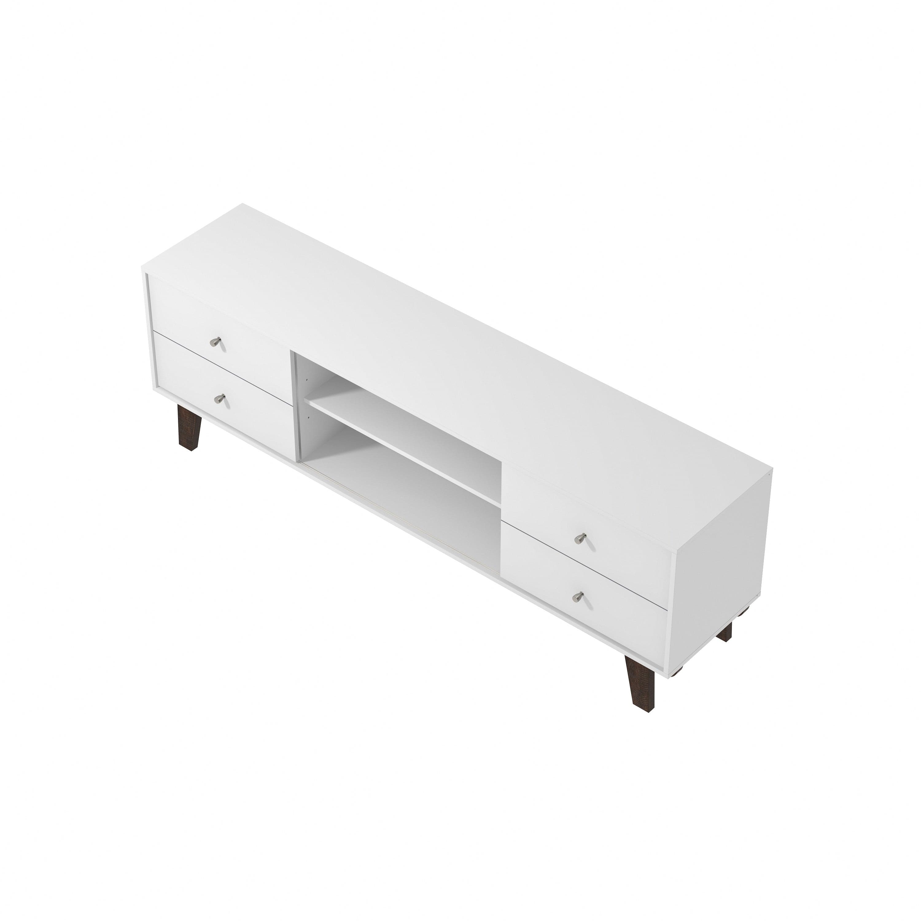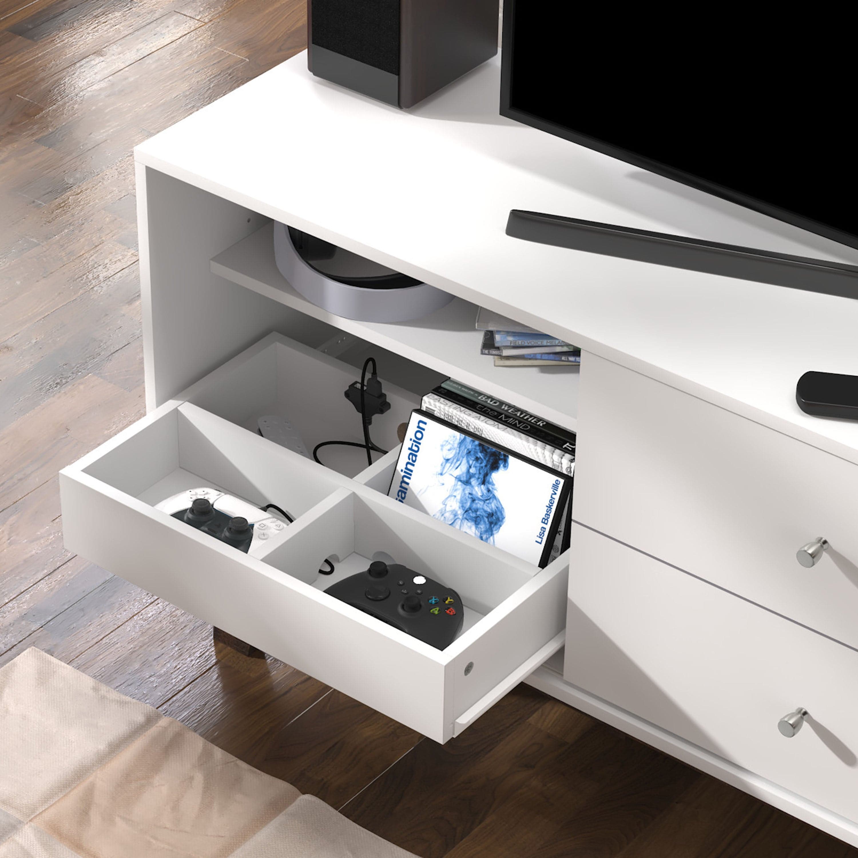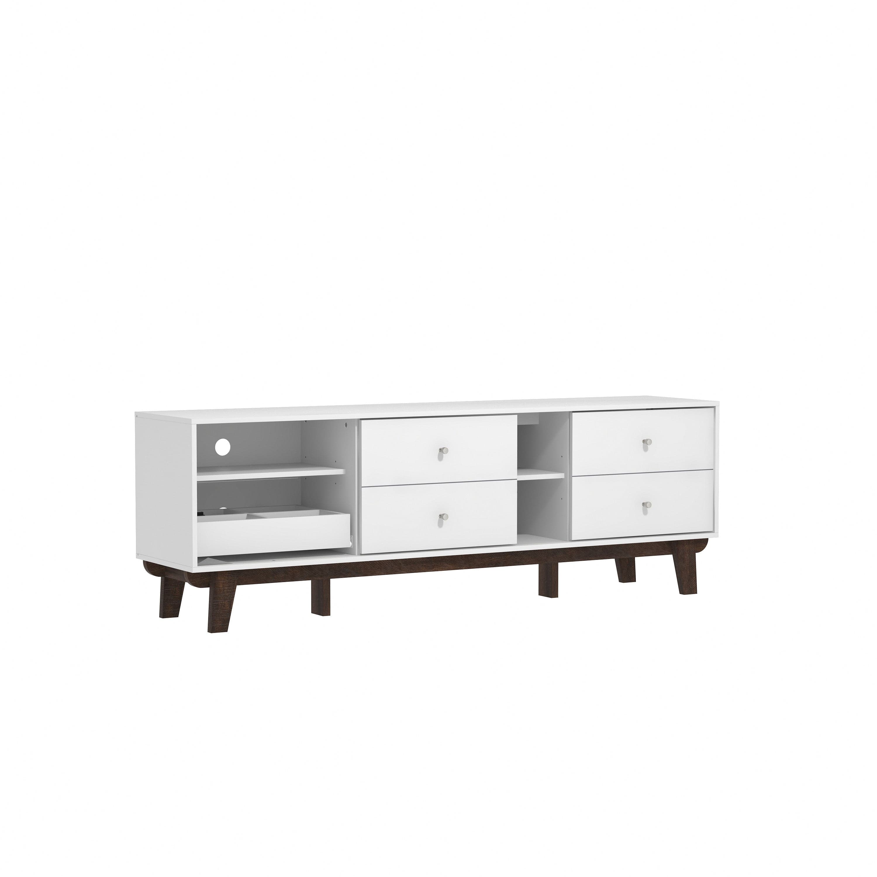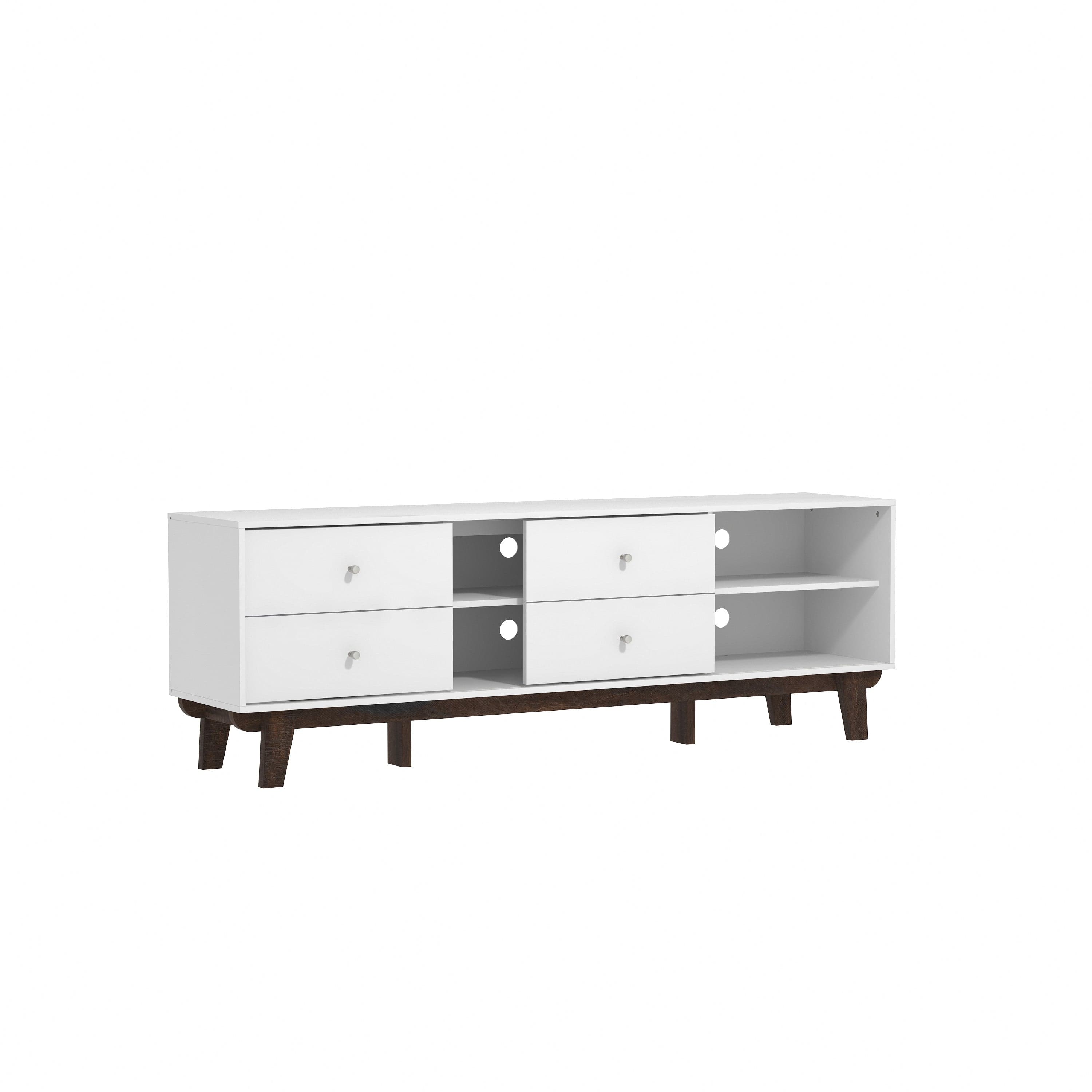 Looking for fun, stylish-yet-functional TV stand that reflects your own style? You've found it! Serving up major mid-century modern vibes, this glammed-up 70-inch entertainment console takes center stage in a versatile matte white finish. Low-profile angled flare legs add a polished look that screams "on-trend." Have a gamer in the house? Four side drawers keep controllers and headsets safely stowed away when not in use while open center shelving and built-in cable management ports keep things nice and tidy behind the scenes. Assembly required.