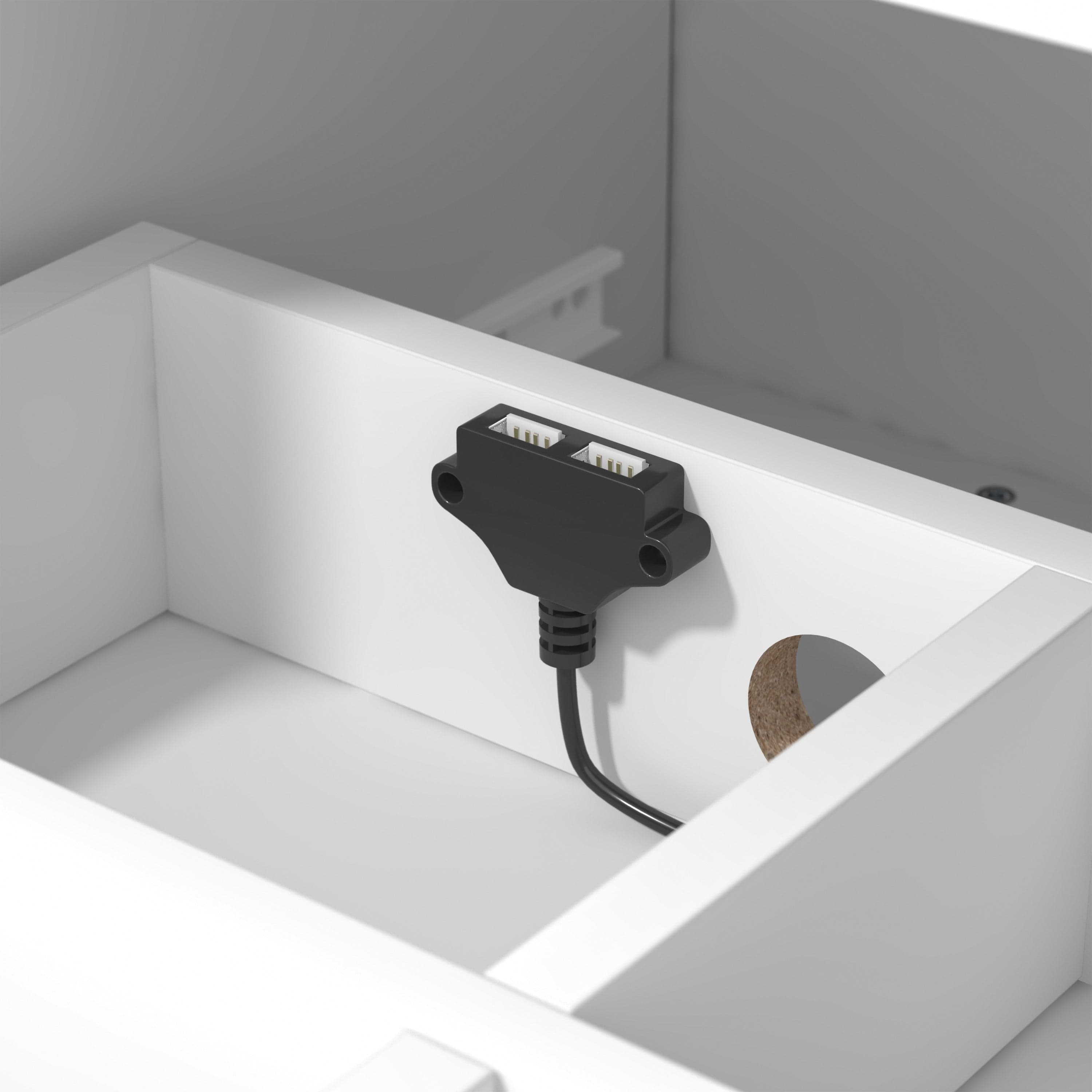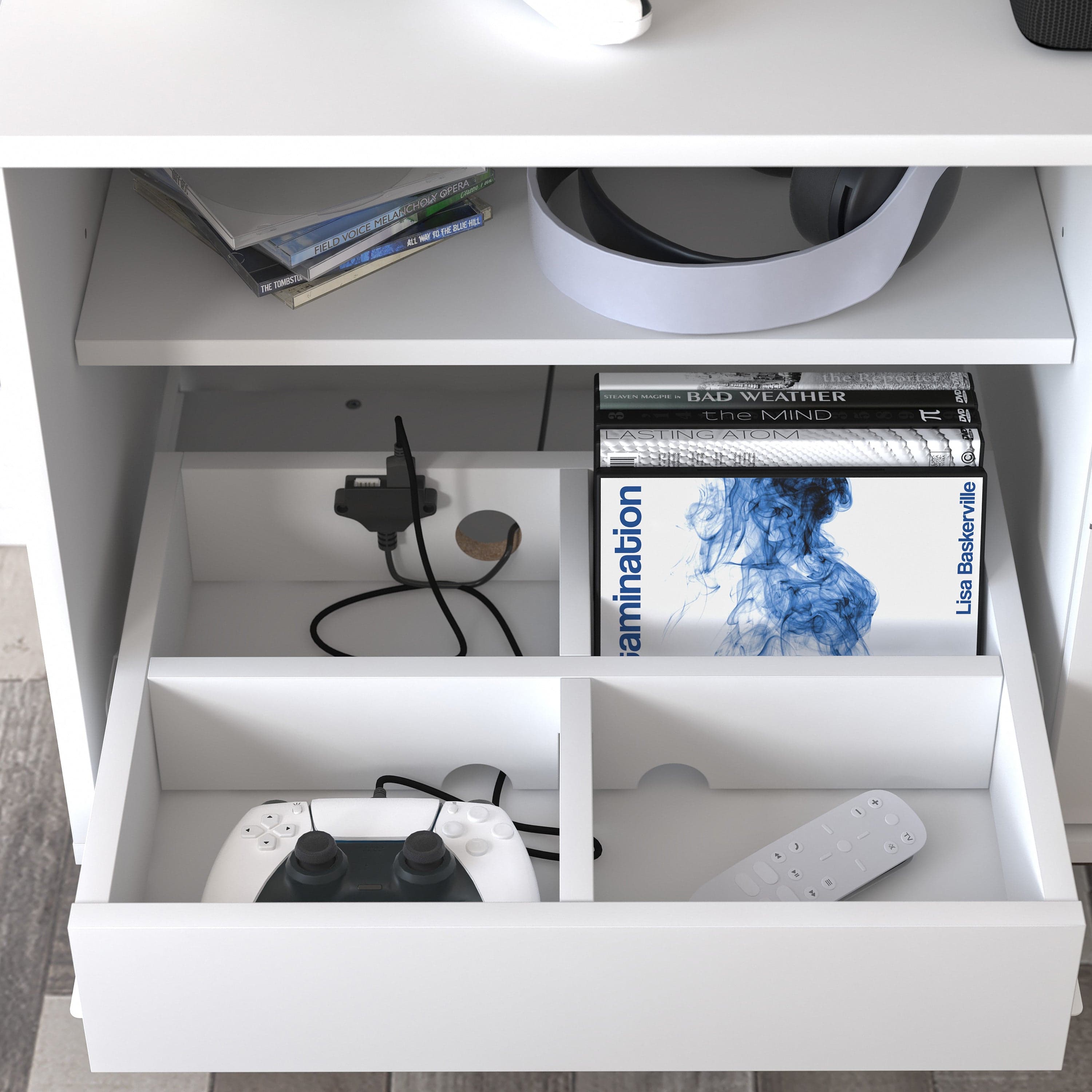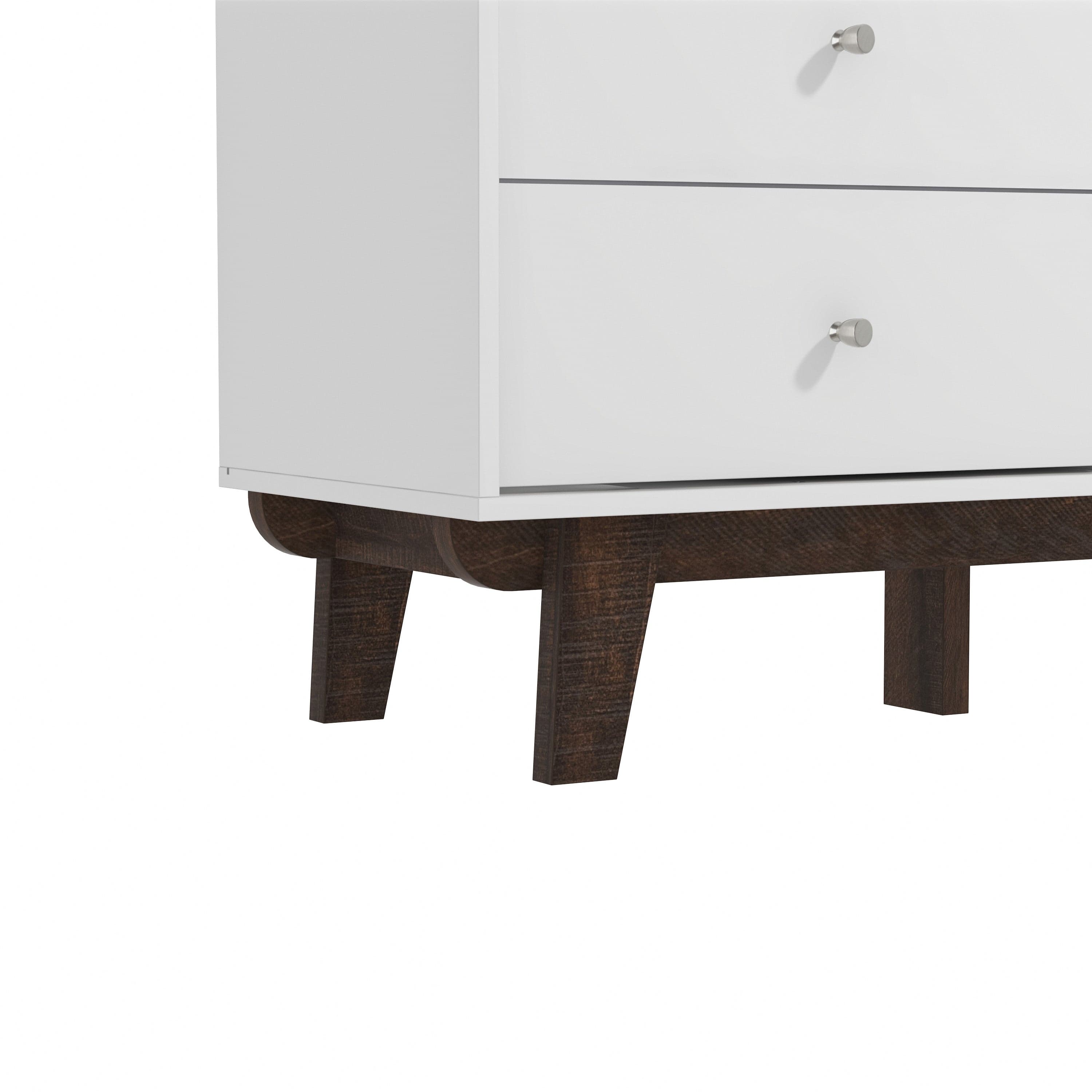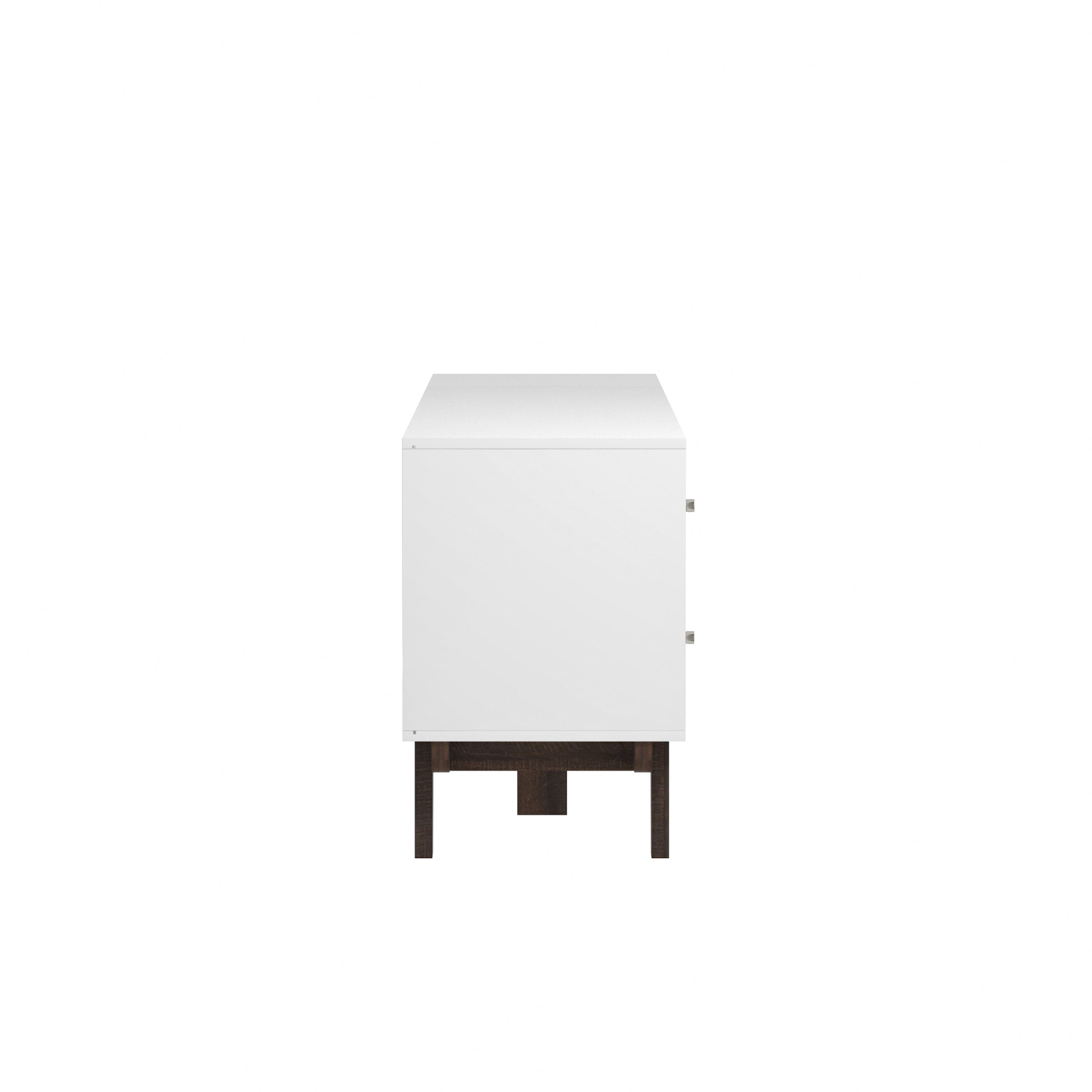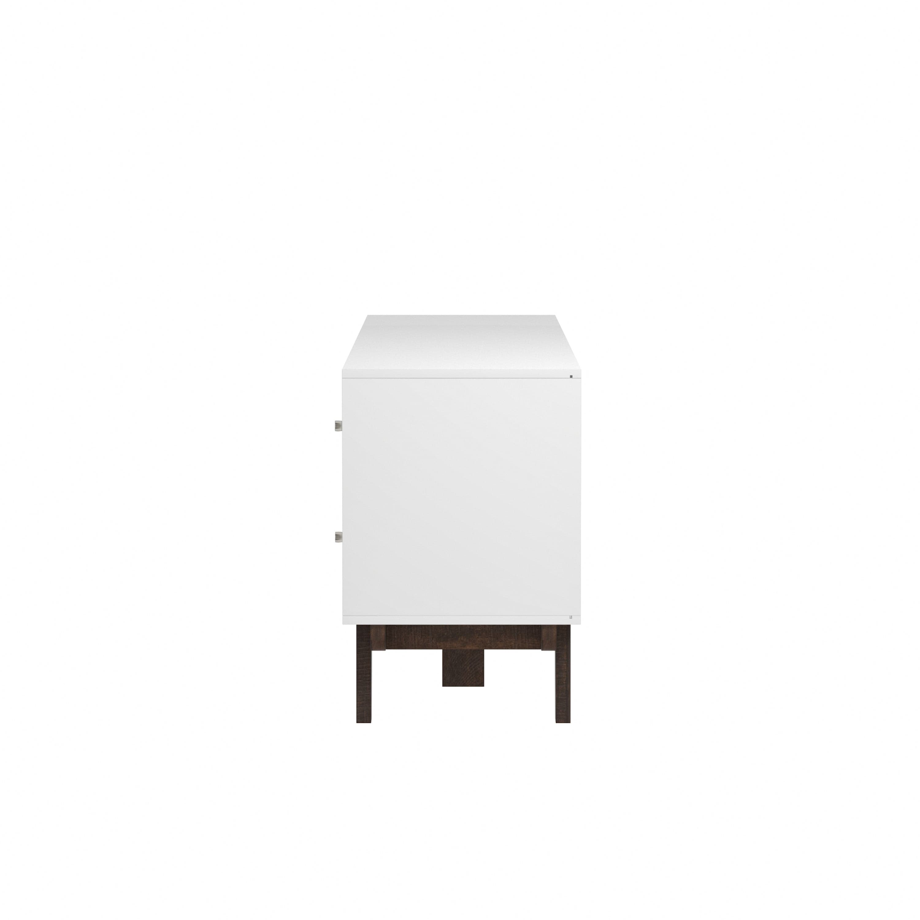 Looking for fun, stylish-yet-functional TV stand that reflects your own style? You've found it! Serving up major mid-century modern vibes, this glammed-up 70-inch entertainment console takes center stage in a versatile matte white finish. Low-profile angled flare legs add a polished look that screams "on-trend." Have a gamer in the house? Four side drawers keep controllers and headsets safely stowed away when not in use while open center shelving and built-in cable management ports keep things nice and tidy behind the scenes. Assembly required.