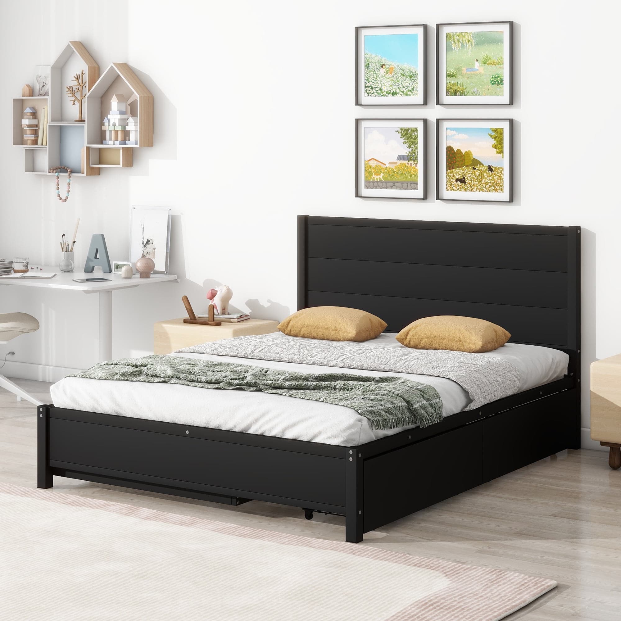 Buy Euroco Queen Platform Bed with 2 Drawers and Trundle,Solid Metal Frame with Headboard for Adults,Black at Walmart.com