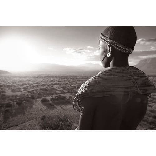 Part of the 'Desert Song: Compositions of Kenya' series by Drew Doggett, this piece features portraits of the Rendille and Samburu tribes, paying tribute to fashion photography. The portraits celebrate traditional dress while blurring geographical and cultural lines, highlighting a harmonious connection with their land. From a limited edition of 75, the print is crafted on Hahnemühle FineArt Baryta paper, renowned for image clarity and color quality. It comes signed, numbered, and includes a certificate of authenticity.