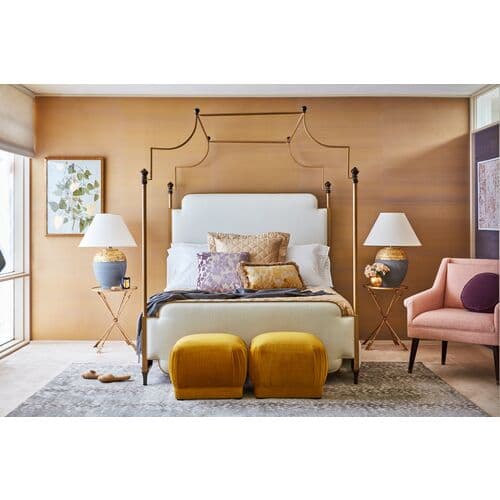 Exclusively available at One Kings Lane, this lofty bed features an iron canopy with a gold finish and soft linen-blend upholstery that enhances its appearance. A mattress and box spring are necessary. Crafted in the USA.