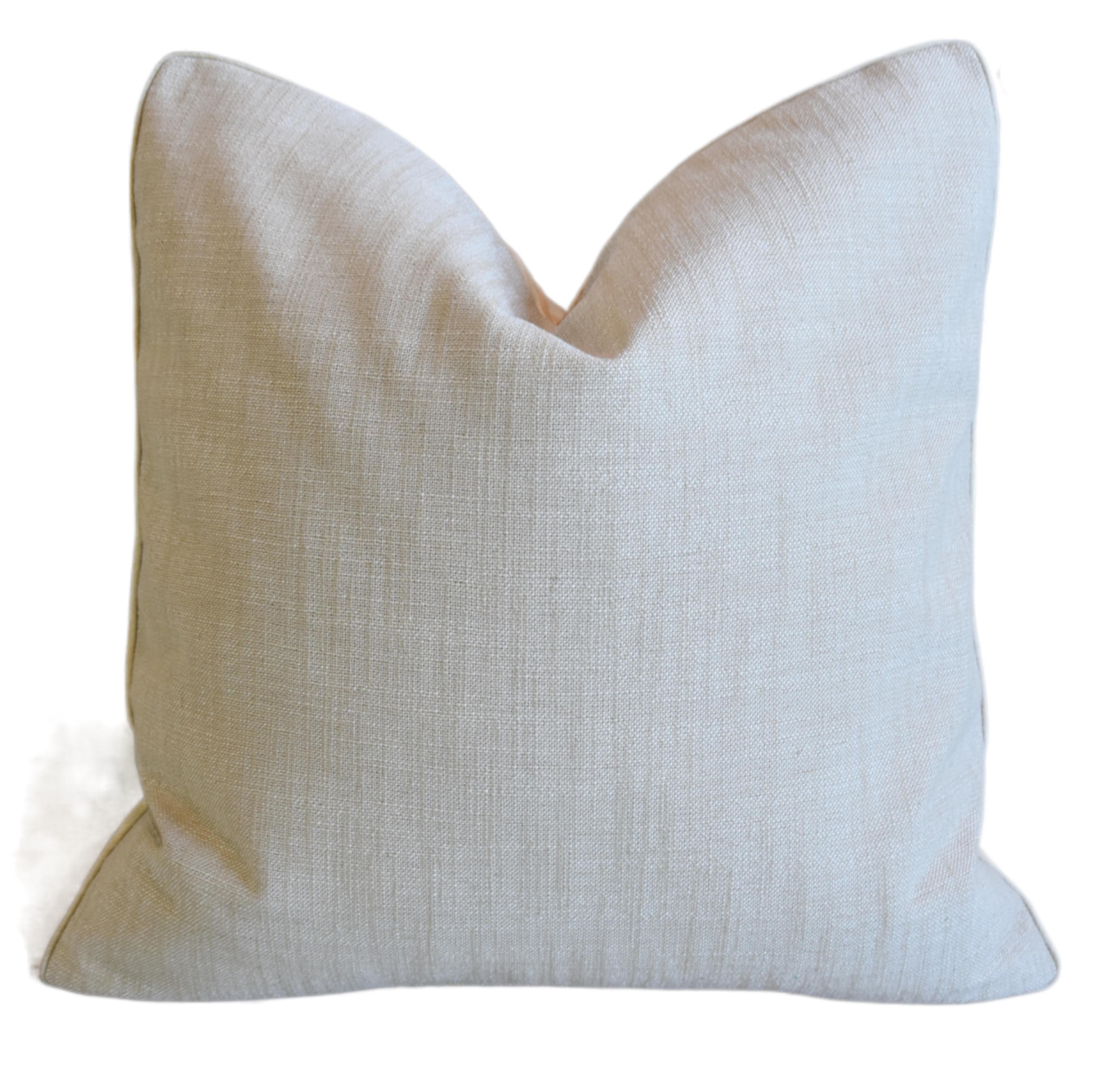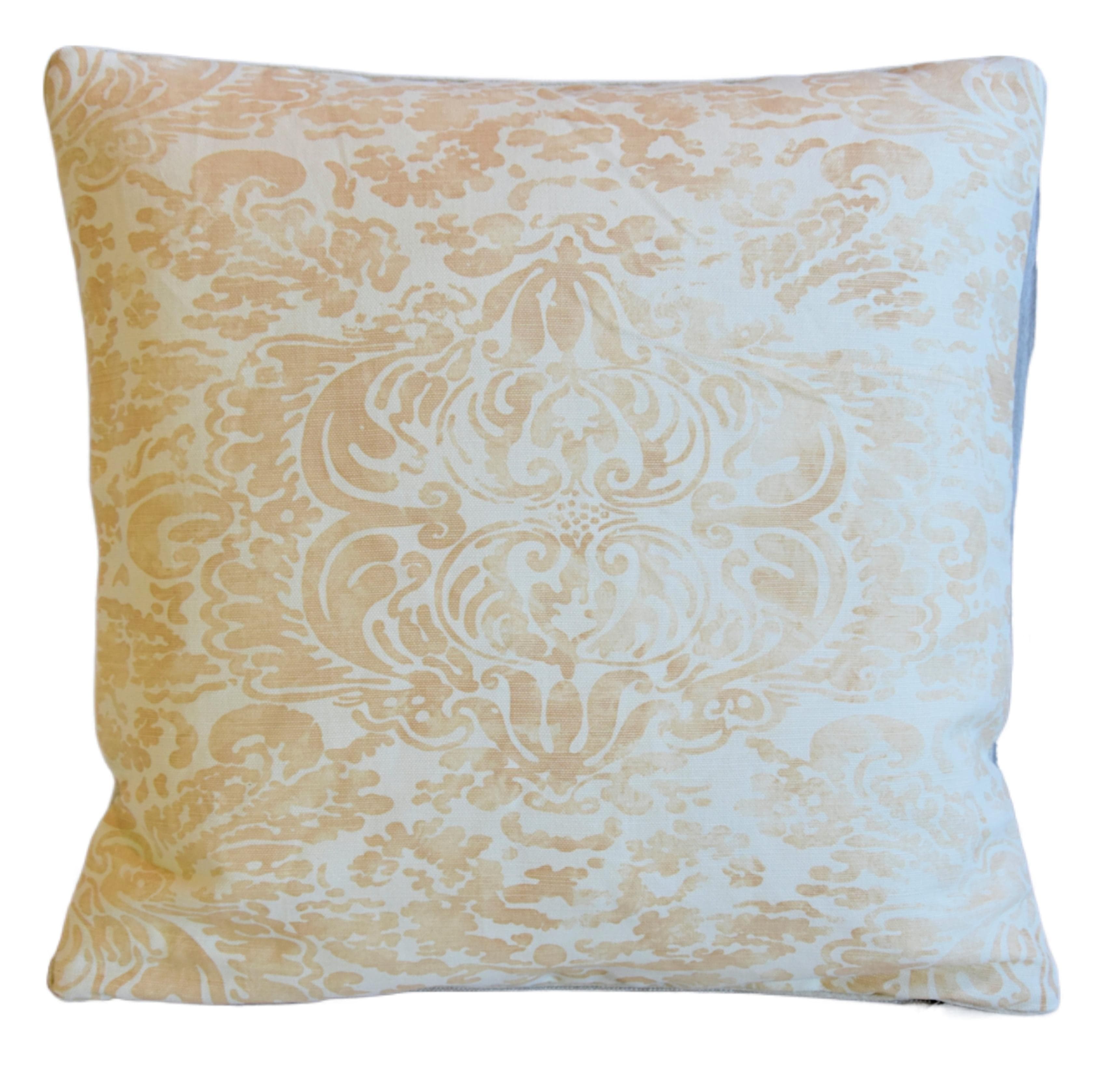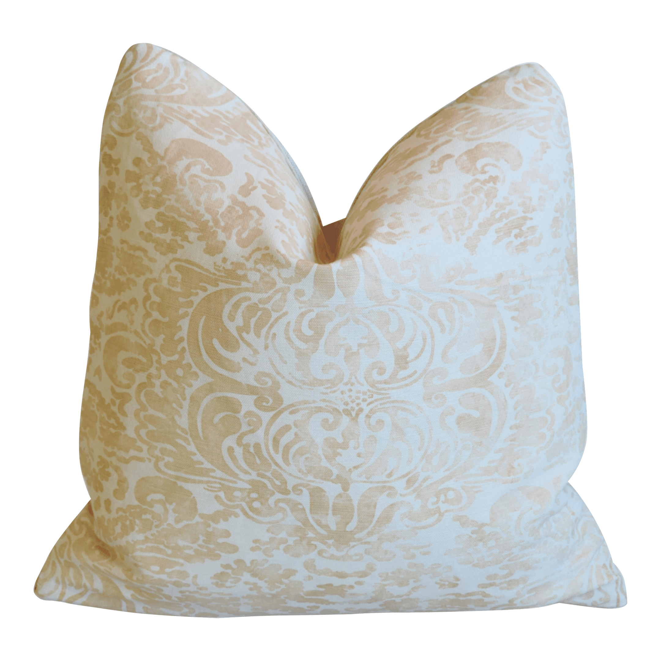 Pillow custom-tailored in Quadrille Textiles' 'China Seas San Marco' printed linen fabric. Features a tan linen fabric back and custom cord trim. Includes a zipper closure for convenience. Comes with a new, plump goose down-and-feather insert. In excellent, unused condition.