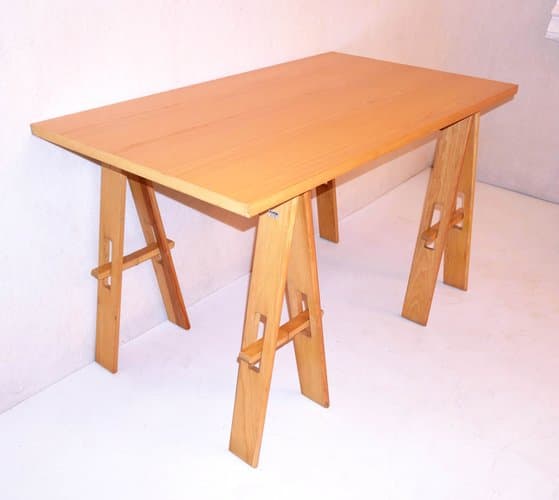 Table on foldable trestles with tensioners in the legs. Top and legs in natural ash wood. Table top locking system using 4 pegs inserted into the stand. Design by De Pas / D' Urbino / Lomazzi for Acerbis, Italy 1968 Closed trestles size: height 70 cm width: 64 cm Easel thickness when closed: 5 cm Shelf thickness 2.5 cm