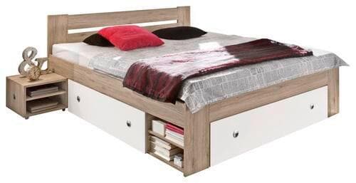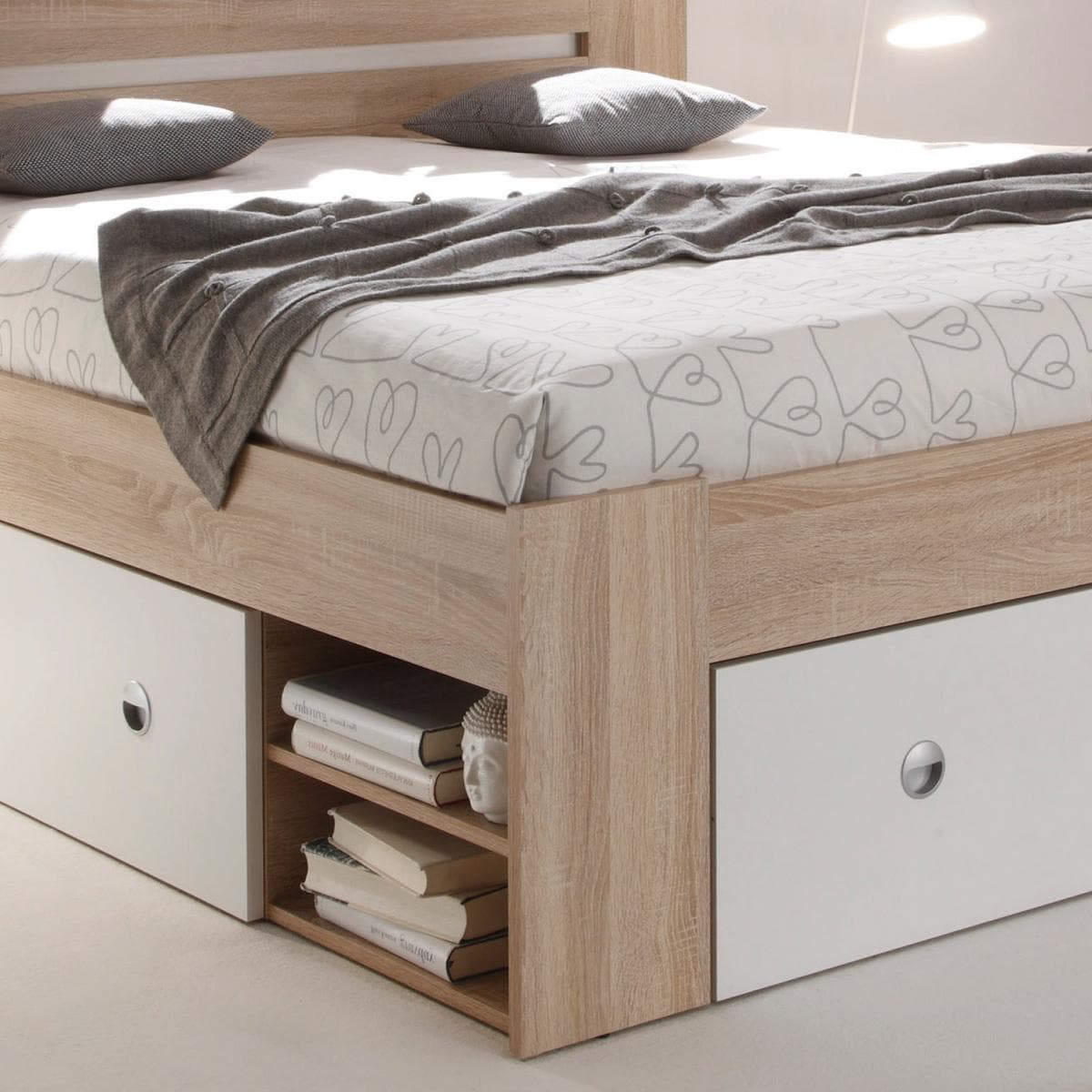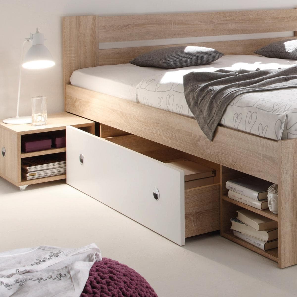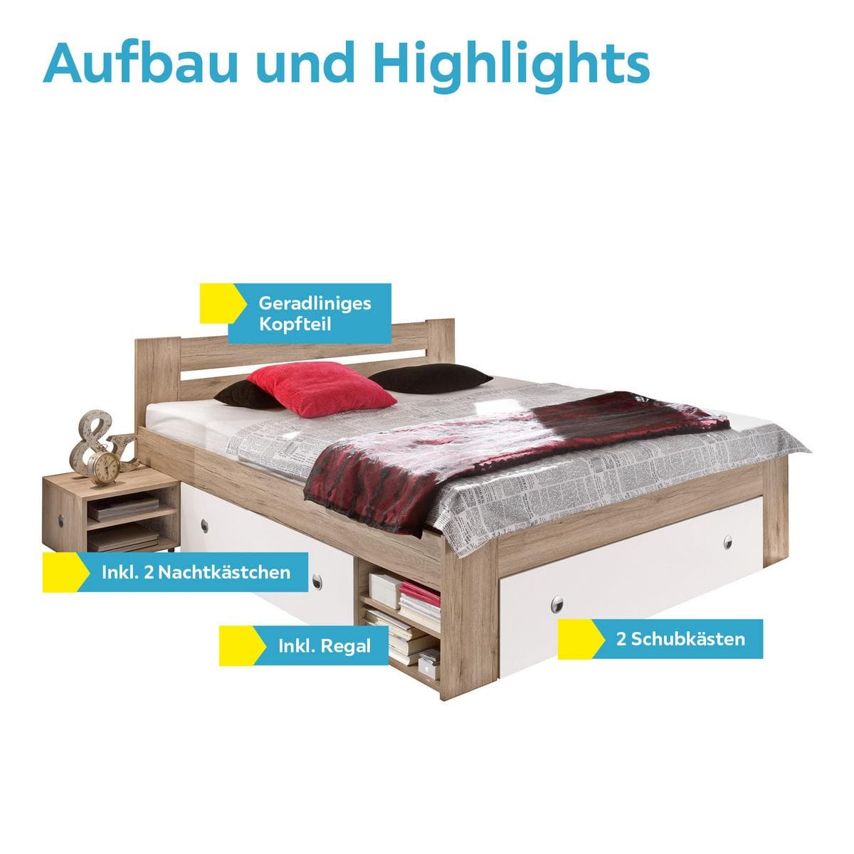 MID.YOU Bettanlage STEFAN ➜ Stauraumbett ✓ inkl. 2 Nachtkästchen ✓ Liegefläche ca. 140x200 ✓ 145x86x204 cm ✓ Eichefarben & Weiß ➜ Mehr erfahren!