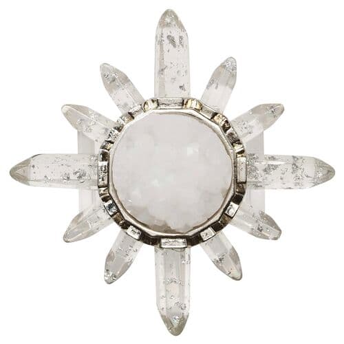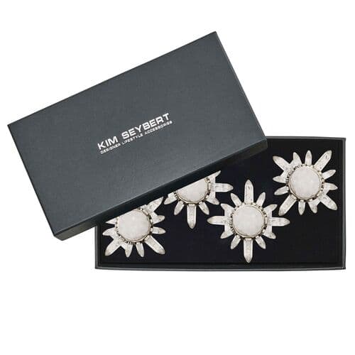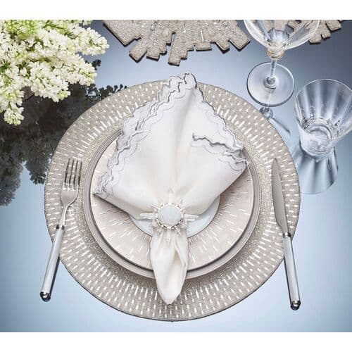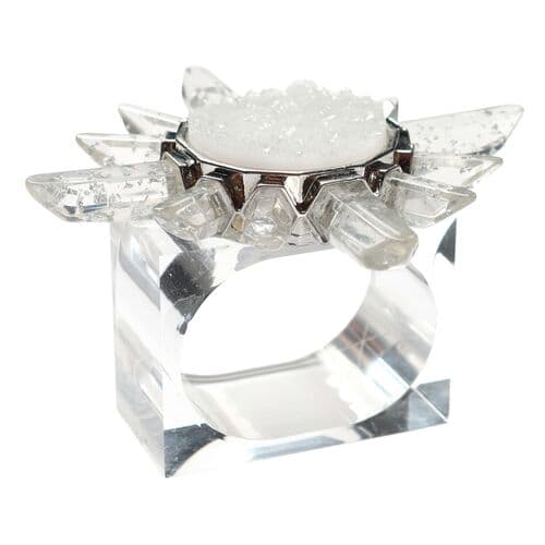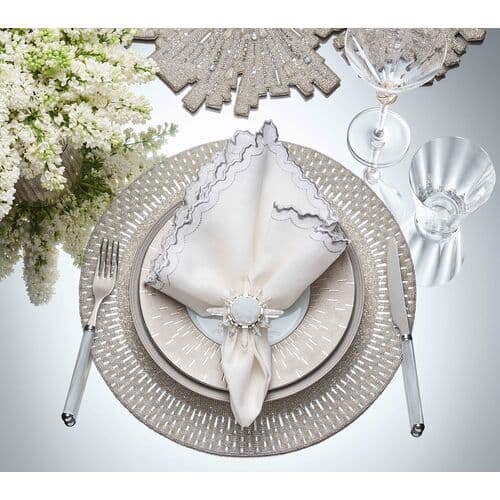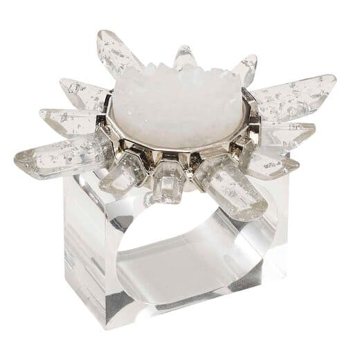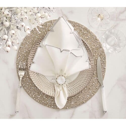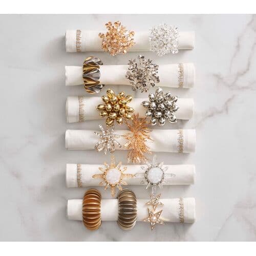 Resembling a royal crown, the Coronet Napkin Ring bestows a stately effect to any table. Hand-made resin beads, featuring gold flecks throughout, are meticulously arranged in a gold-plated setting around an acrylic crystalline stone. This regal napkin ring is a splendid choice for grand events and festive dinner parties, creating an ambiance fit for a king or queen with its luxurious and majestic design. Perfect for holiday gifting, the napkin rings are sold in a boxed set of four.