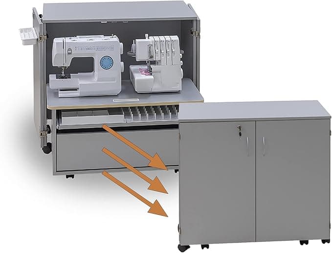 Compacte en functionele tafel / kast voor naai- / borduurmachine. Deze tafel is ontworpen voor naaien, borduren, knutselen en hobby, voor alle soorten huishoudelijke naaimachines en lockmachines. Voldoende ruimte om opbergruimte te bewaren met vak voor vakjes, draadspindels (voor 56 stuks) en grote lade.