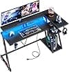 Korfile Computer Gaming Desk with Power Outlet & LED Lights, Reversible L Shaped Gamer Table with Storage Shelves for Bedroom, Corner Home Office Desk, 55 Inch, Carbon Fiber Black