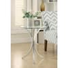 Smooth and simple, this chrome snack table offers a modern feel. Constructed of metal, the base consists of three curved legs in a bright chrome finish. Complement the metallic radiance with a clear tempered glass top.