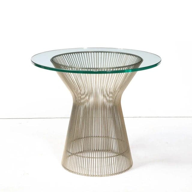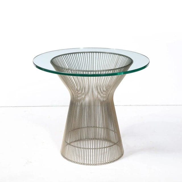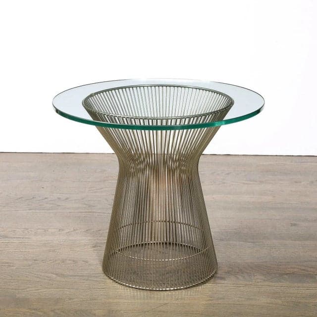 This Bent and Polished Nickel side Table designed by Warren Platner originates from the United States, Circa 1970. Featuring an hourglass form in a series of parallel nickel cylinders, the geometric minimalist construction is characteristic of Mid-Century Modernist design and elegantly supports the round transparent glass top. Streamline and brimming with character though its minimalist form, this side tables sports versatility and creative use of materials beautifully executed. This piece will style brilliantly in a wide array of interiors and movements, from classic Mid-Century to Contemporary Interiors. Excellent vintage condition.