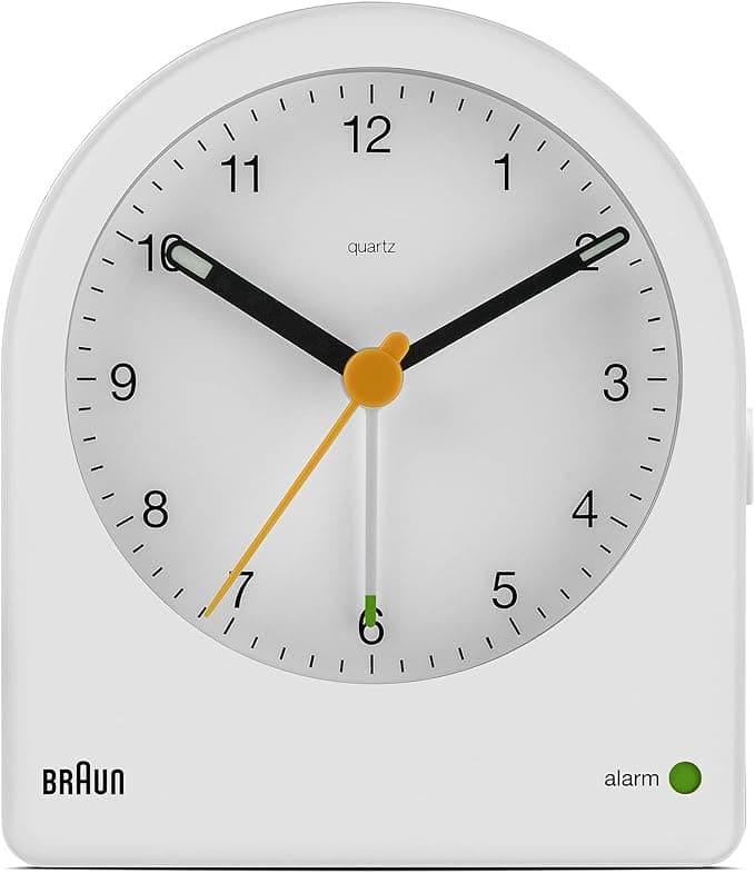 Braun Classic Analogue Alarm Clock with Snooze and Continuous Backlight, Quiet Quartz Movement, Crescendo Beep Alarm in White, Model BC22W.