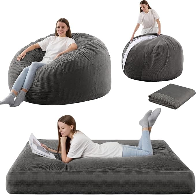 HABUTWAY Bean Bag Chair, Giant Bean Bag Chair with Washable Corduroy Cover Ultra Soft, Convertible Bean Bag from Chair to Mattress, Huge Cordoroys Bean Bags for Adult, Couples, Family (Grey Full)