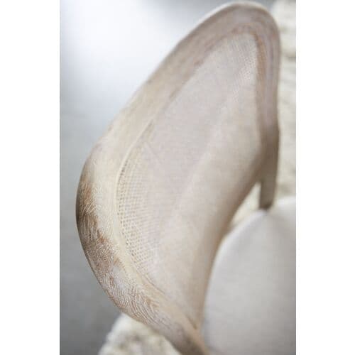 These dining chairs feature a beautifully crafted oak frame, combined with caned seat backs and a linen-blend fabric. They add a touch of French farmhouse style to your dining experience.