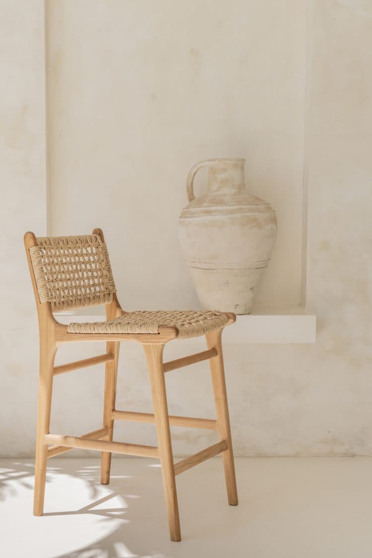 Casa chair stool Natural Square Weave with back rest inspired by Island luxe life a blend of beautiful timbers and textures. Timber frame handcrafted by skilled artisans constructed from teak wood & synthetic rattan square weave webbing. The perfect counter top stool for your coastal or mediterranean outdoor kitchen servery, entertaining area or kitchen space.