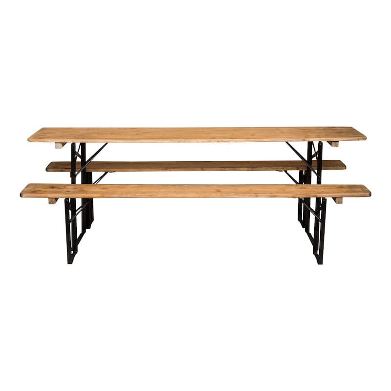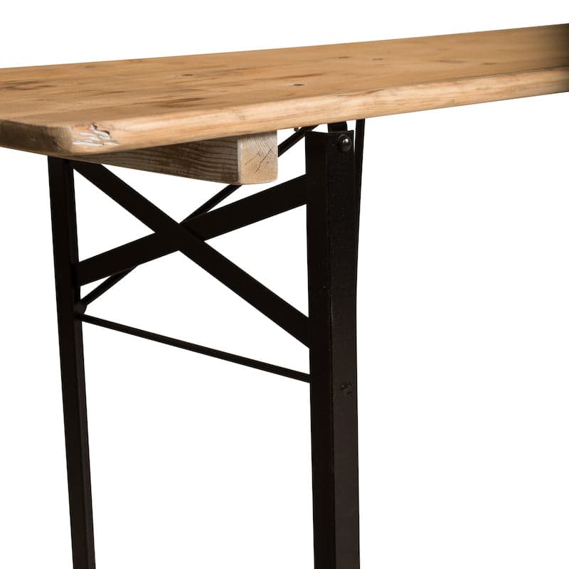 Vintage wood biergarten table from Germany with black metal folding legs. Simple yet elevated dining or display tables for any curated event or wedding. Can be put together to create long dining scapes. Matching benches available. Available in two sizes, from 78.5' to 86.5'. Seats 6-8.