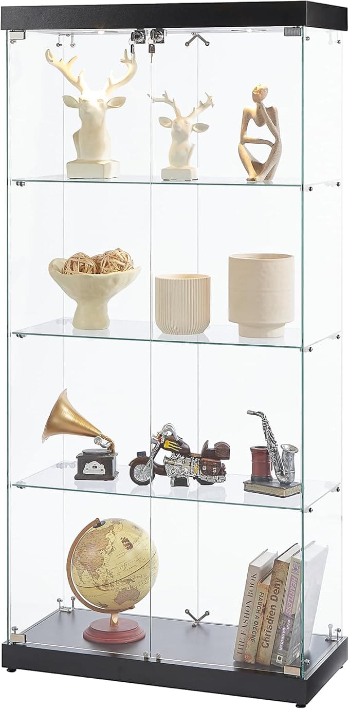 Glass Display Cabinet, 4 Tier Display Cabinet, Clear Double Door Glass Floor Display Cabinet for Living Room, Bedroom and Home Office, 31.5" W x 14.2" D x 66.3" H (Black)