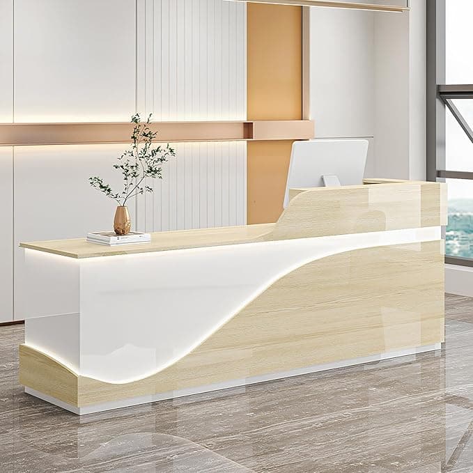 Ample Storage: The top platform offers ample space for storing laptops, projectors, or any presentation materials. The secondary platform is for organizing office and presentation essentials, keeping your workspace clutter-free and efficient. Specification: Name: Reception Counter Desk, Material: E1-level environmentally friendly thickened boards, UV glossy finishes, Size: 12060100cm, 13060100cm, 14060100cm, 15060100cm, 16060100cm.