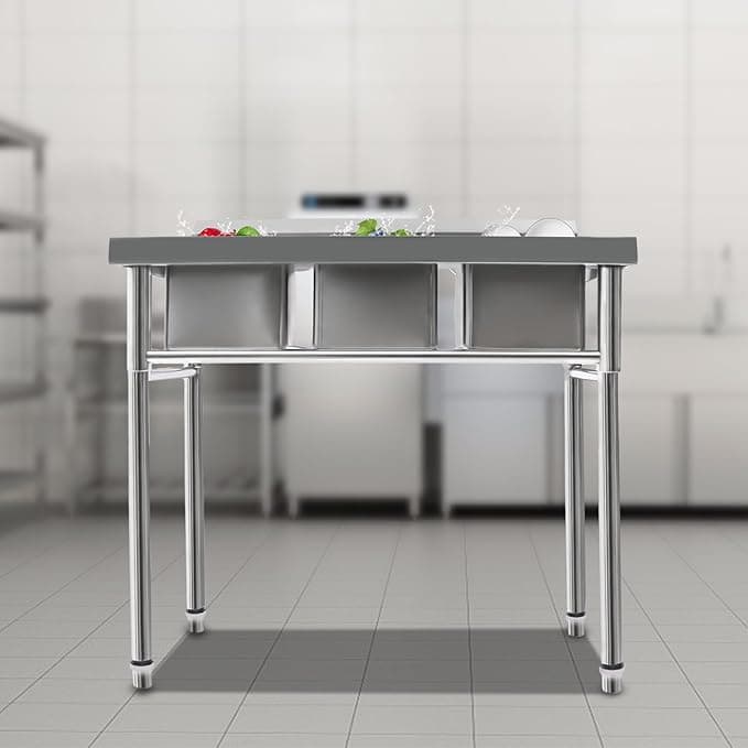 This commercial stainless steel sink is a great cleaning aid for washing fruit and vegetables, clothes, cutlery, and kitchenware. With three deep sinks, it can handle a large number of cleaning tasks on commercial premises. It is made of thickened stainless steel, so it has excellent resistance to rust and corrosion.