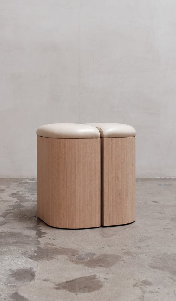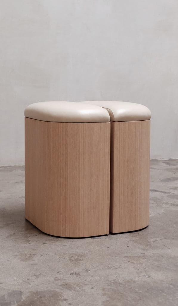 Wood stool with leather upholstered seat. Shown in black stained ash with black leather and natural oak veneer with taupe leather. Also available in COM (Customer’s Own Material) or COL (Customer’s Own Leather.) Client must supply fabric swatch for approval prior to production. 0.5 yards of fabric is required for COM. Handmade by Estudio Persona in Los Angeles. Shipping charges will be invoiced separately. Please note that all Estudio Persona pieces are made to order and are final sale. No returns or exchanges.