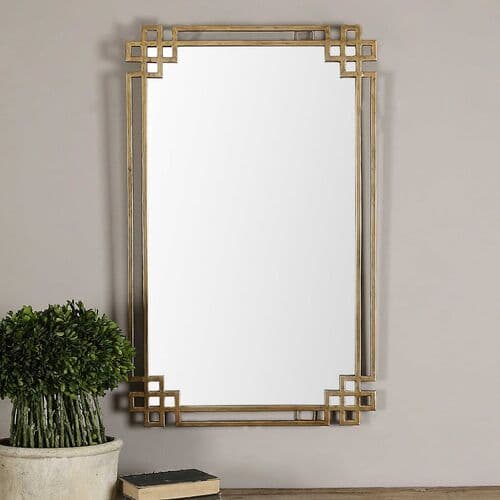 The mirror features an ornate, hand-forged metal frame with a plated, oxidized gold finish and light antiquing. It offers versatility in placement, as it can be hung either horizontally or vertically.