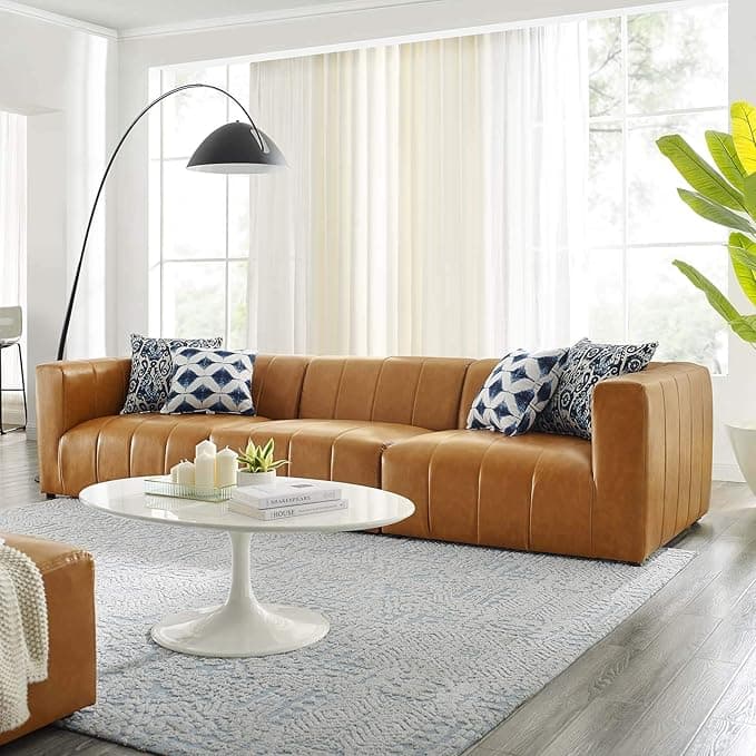 Indulge in comfort and relaxation by creating a custom living room and lounge area with the Bartlett Vegan Leather Sofa. Featuring subtle channel tufting, rounded corners, and vegan leather upholstery, this three-seater sofa brings retro modern style and contemporary allure to your living space. Dense foam padding and a pocket coil spring system in the cushions offer a luxe seating experience with premium support and comfort. With a sturdy frame crafted from solid wood and plywood, this living room sofa features modular connectors to keep each sectional sofa piece secure and non-marking foot caps to protect flooring. Each Piece Weight Capacity: 331 lbs.