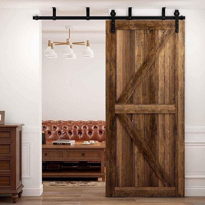 Mainly suitable for opening don't have enough beam space to mount track. Suitable for door thickness: 1 1/4"-1 7/8", Weight capacity: 220lb per door. The length from top of the door to the ceiling is 6.02". Smoothly&Quietly, Color: black. Hanger Material: carbon steel with premium nylon wheels, smooth and no noise when sliding your door. Package includes all needed accessories. Easy to install with step-by-step detailed instructions.
