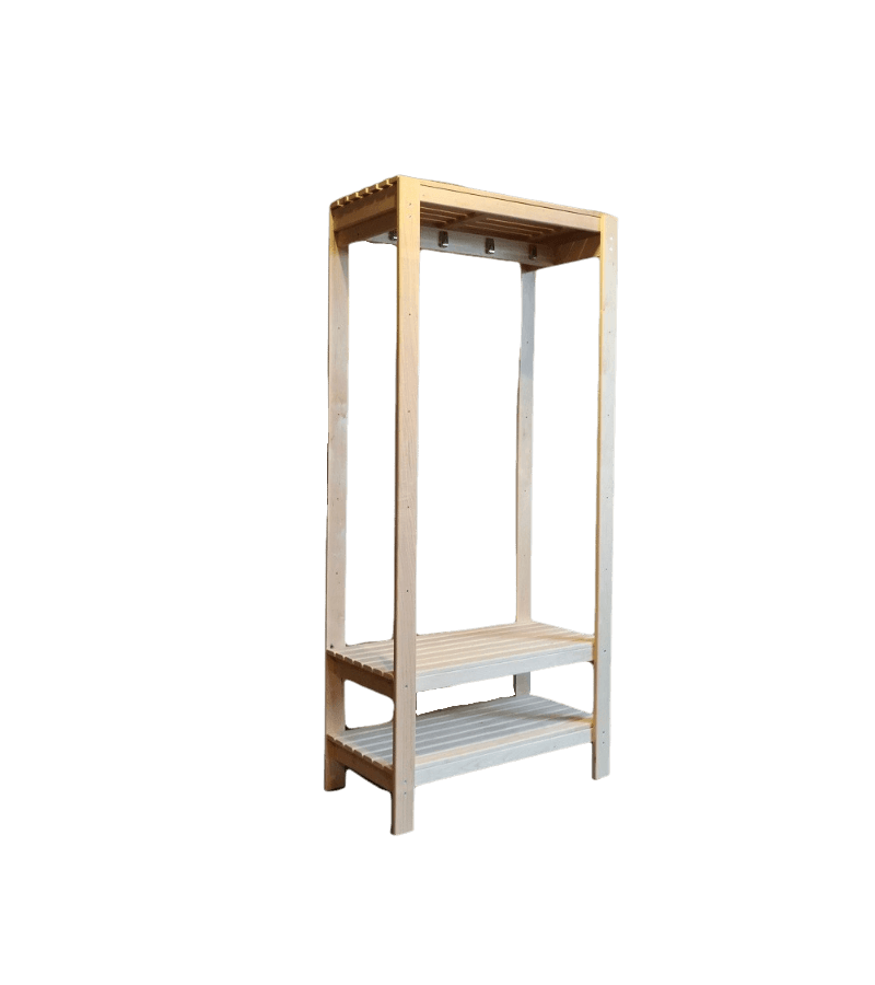 Made from alder wood (natural wood i.e. not covered with finishing). Floor-standing coat rack that is two-in-one – hanging hooks and shelves. 4 hooks for hanging and 3 shelves for storage – practical and space-saving. Suitable for living spaces for hanging (shorter) outerwear and other clothing as well as in the sauna anteroom for hanging and storing towels. The top shelf part is easily removable and can be used without it if desired. The coat rack is delivered in parts, with assembly instructions and necessary fasteners included. Packed in a cardboard box for transport.