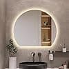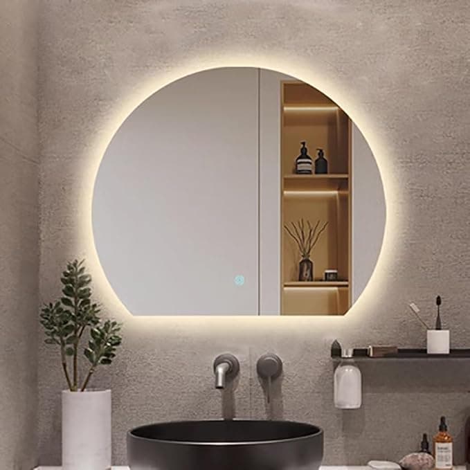 Espejo de baño moderno e inteligente, diseño semicircular único, muy adecuado para baños, dormitorios, salones, entradas, tocadores, hoteles, salones de belleza y otros lugares. Luz tricolor regulable que crea diferentes ambientes. Función de desempañador incorporada para mayor comodidad.