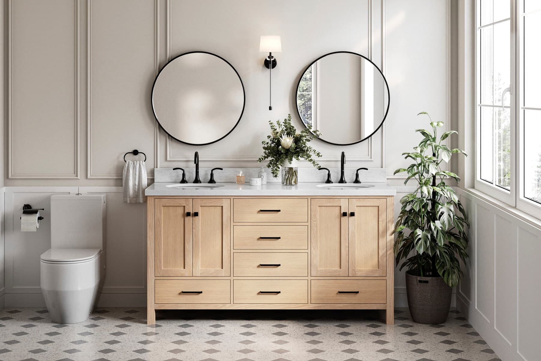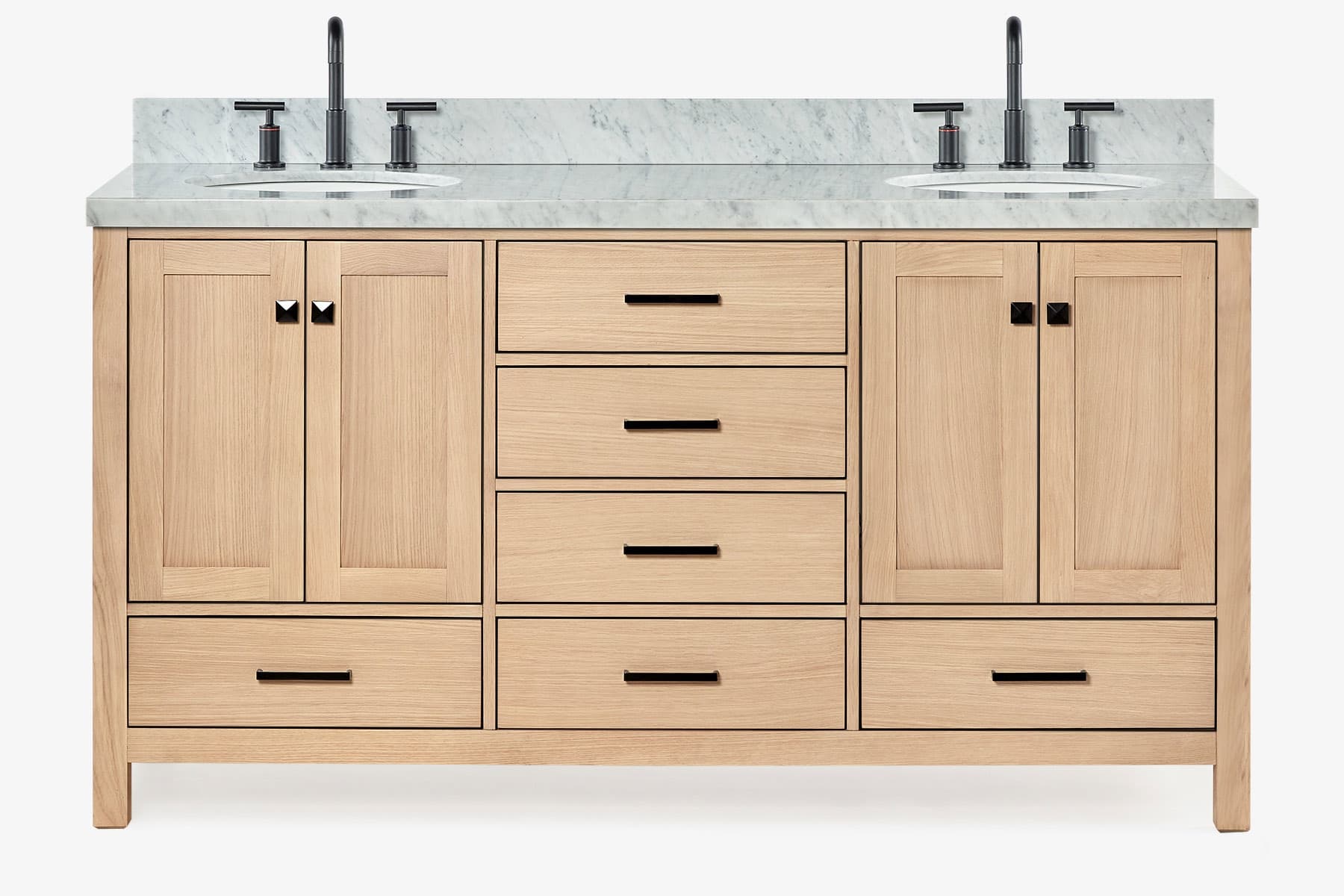 Featuring quality solid oak veneer construction, The Cambridge bathroom vanity from ARIEL Bath combines the natural warmth of wood and the elegant Italian Carrara Marble or Quartz countertops with metal hardware that is the perfect choice for your bathroom remodel.