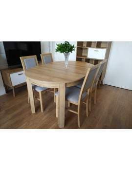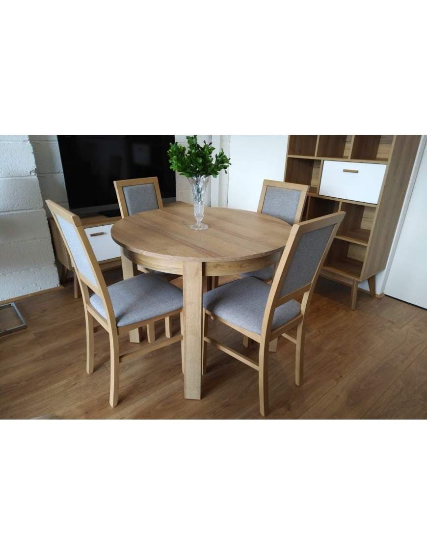 Introducing our exceptional high-quality round dining table - the Set Bernard round extending table with 4 chairs. This table may appear small, but it has a hidden secret - it extends to almost 2 meters! Perfect for accommodating large gatherings or intimate dinners. Embrace the beauty of the oak riviera color, which adds warmth and elegance to any dining space.