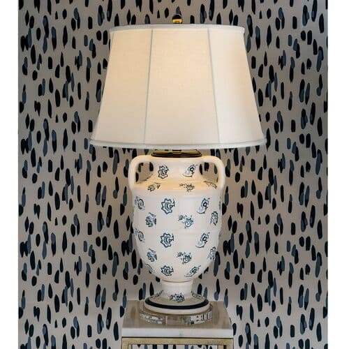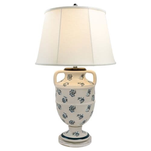 A new classic inspired by far-flung elements such as the lotus flower and other fresh plucked blossoms, this piece features a glorious urn design influenced by an antique floral block print market find. It showcases a harmonious blend of colors against a crackled porcelain urn, complemented by a wood cap and lucite base. The design is completed with a nickel ball finial and a 3-way switch, supporting up to 150 watts. The soft back empire shade is crafted from off-white linen/cotton fabric, with a nickel spider. Materials include porcelain and lucite.