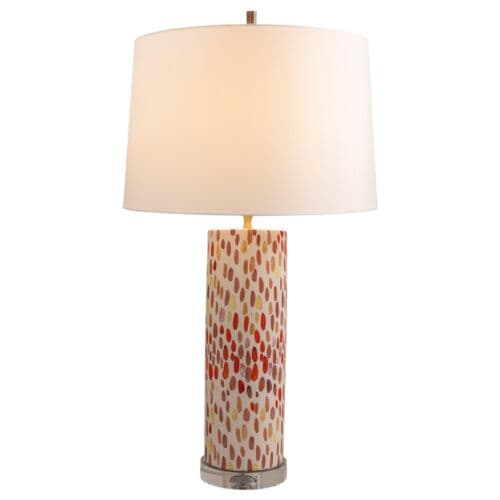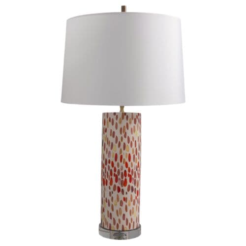 This pattern offers a painterly aesthetic on porcelain, translating into positive energy with vertical dashes of color. Accents include aged brass hardware and an acrylic round base, complemented by a metal aged brass cylinder finial. It accommodates a 150 watt max bulb with a 3-way switch. The lamp features a hardback round drum shade with a soft rolled edge, crafted from ivory polyester fabric, and includes a brass spider. Materials used are porcelain and acrylic.
