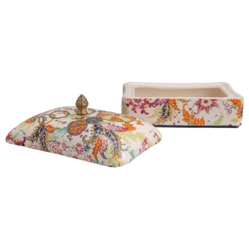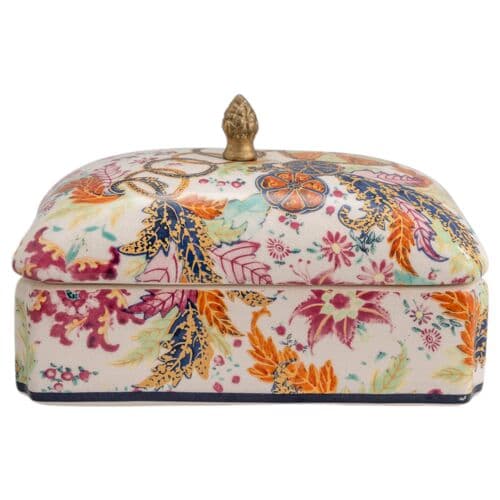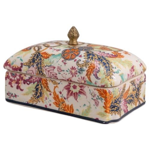 The highly coveted floral pattern has adorned homes since the 18th century. Inspired by Asian plants and Indian textiles, the pattern features hibiscus and pomegranate motifs. Collectors commonly refer to it as the "tobacco leaf" pattern, and it was a fashionable import as fine china. This pattern was the most highly valued of all the dinnerware patterns of the 18th century. The rectangular porcelain box has a lift-off lid and solid brass finial. The box is perfect for hiding small things or keys, or as a decorative accessory in the powder room.