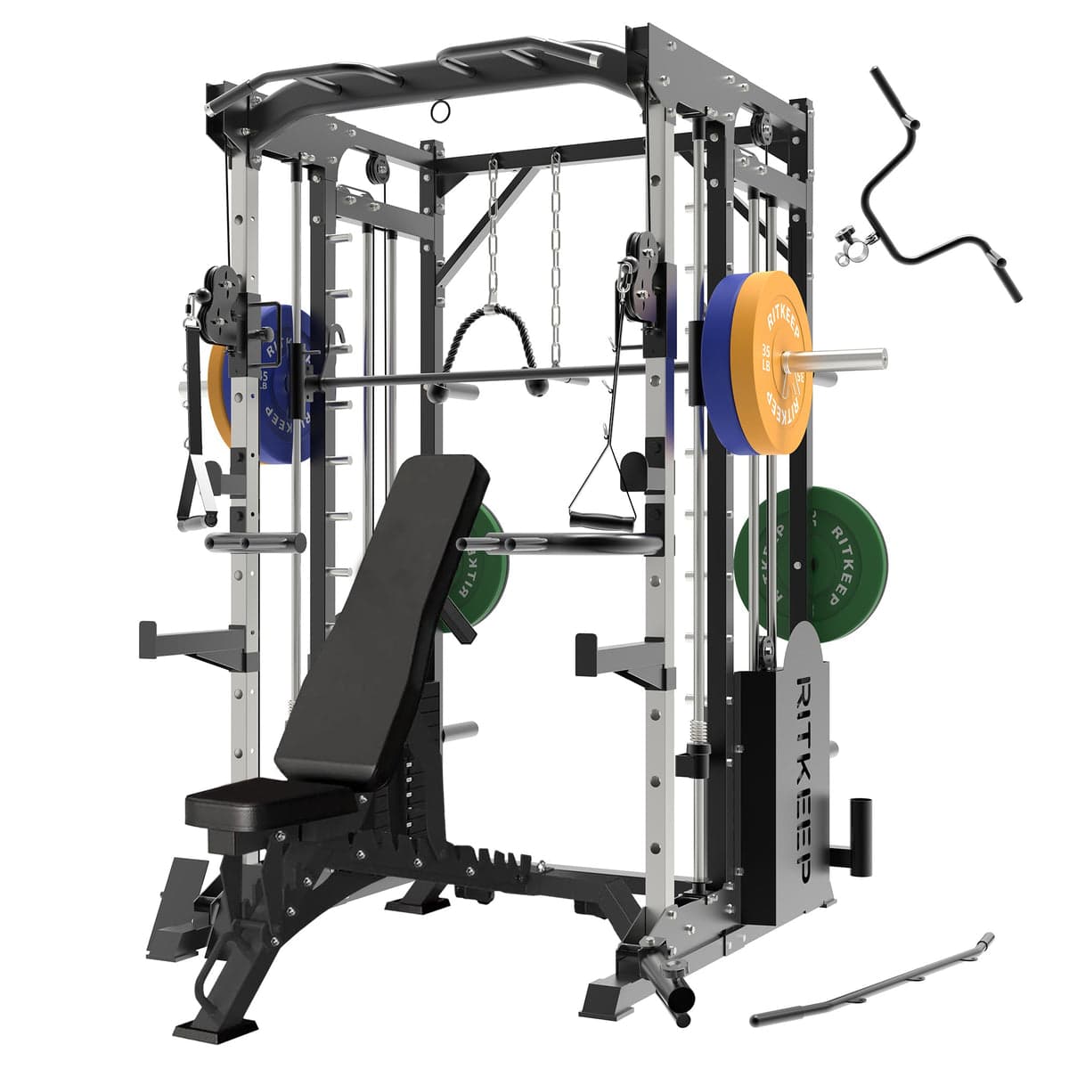 Buy Ritkeep PMAX 5600 Smith Exercise Machine, all-in-one complete home gym package that integrates a 326LB weight stack smith machine, power rack, cable pulley system, multi-grip pull-up bar, and landmine.