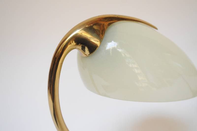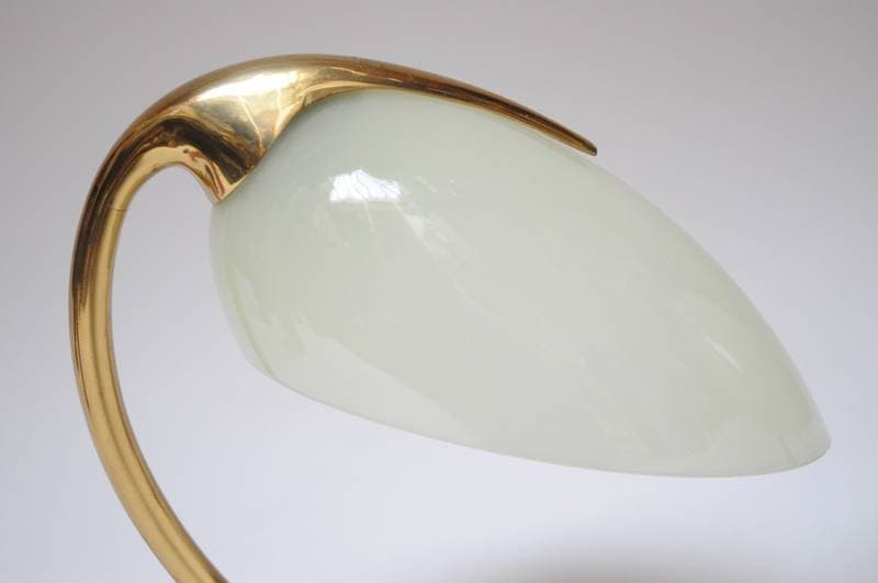 Petite bedside/table lamps designed by Oscar Torlasco for Lumen Milano (ca. 1950s, Italy). Composed of deeply sculpted brass curved frames forming a tripod base and a ‘cradle’ top supporting the pale green blown glass shades. Glass is original, not replaced, as seen in other examples. Brass has been newly polished and shows only light tarnish/one ding to the back. One of the shades has an flaw in the glass appearing as deep scratch or crack. It’s an imperfection within the glass itself, difficult to detect, depending on the light. See images for details. Original Italian sockets, wiring, and plug (plug will be changed for US use, unless otherwise requested). H: 8″ x L: 6″ x D: 4.5″