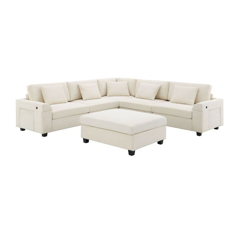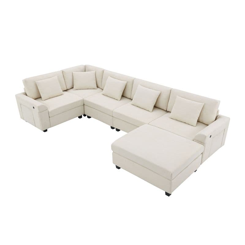 This sofa features a modern U shape design, suitable for living room, bedroom, cafes and other spaces. The sofa comes with removable ottoman that can be used as a footstool or additional seating. This sofa is equipped with built in USB ports for charging devices and convenient cup holders. The sofa is made of comfortable material, high-density sponge and springs for better support. Assembly required. This sofa comes with all necessary parts and installation manuals.