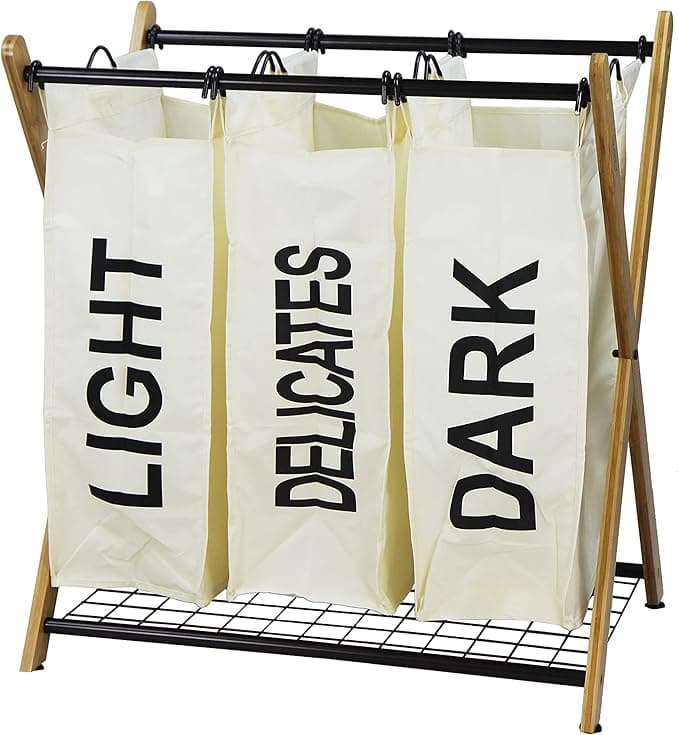 Doing your laundry has never been this effortless and convenient! The Oceanstar X-Frame Bamboo Laundry Sorter does the job for you with its 3 bag compartments to sort your dark, delicate, and light items as you put dirty laundry into your hamper. With 3 grids marked “dark, delicate and light”, laundry is made easier. The removable handle bars on each bag allow you to grab and go hassle free. It is perfect for families, kids, or individual use. Whether as a gift or for your own use, the elegant and modern design of the Oceanstar X-Frame Bamboo 3-Bag Laundry Sorter is a great addition that will accentuate any bed and bath decor.