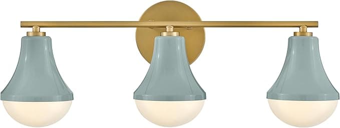 Lark Haddie 85513SF Modern Three-Light Bath Vanity - Fixture Mounts Up or Down, Shades Secured in Place - Seafoam + Lacquered Brass