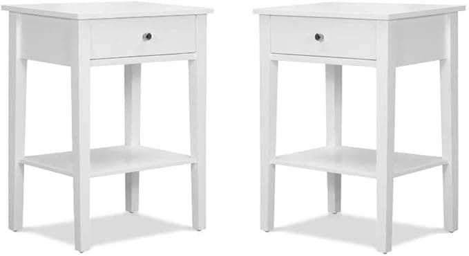 Included Items: Sloan Side Table White x 2. For quicker processing, your order could be split into separate packages. Sloan Side Table White Perfect for displaying family photos or keeping your magazines organized, this end table is a stylish addition to any living room. In a graceful classic design that transcends home décor trends. Available in a charming white finish that complements most decor schemes. The timeless tapered wood legs of this design will never go out of style. The square table top, lower shelf, and storage drawer provide ample space for your favorite decor. Features: Refreshing white finish looks great in any room. Storage space on the ample square table top, lower shelf, and drawer. Graceful classic design transcends home décor trends. Simple straight legs add to the sleek design.
