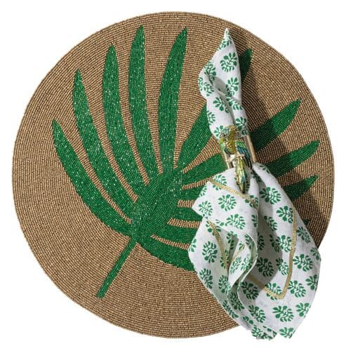 This palm frond placemat will bring a tropical wonder to any event... and imagine it with parrot napkin rings!! I am seeing this leaf shape everywhere now and I love this BOLD interpretation on this charger in green and gold. Hand beaded in India with glass beads backed in cotton. 15" diameter. Slight imperfections may occur as these are all created by handSpot clean with a dry brush
