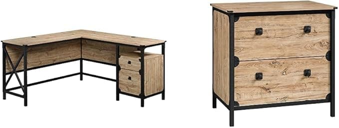 Sauder Steel River L-Shaped Desk (59.84" x 57.32" x 29.53") Steel River Lateral File (30.08" x 20.75" x 29.53") Bundle, Milled Mesquite Finish