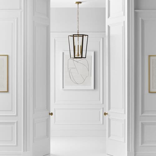A six-sided lantern with three bulbs that enhances both traditional and contemporary rooms. It's suitable for damp environments and can be installed on sloped ceilings.